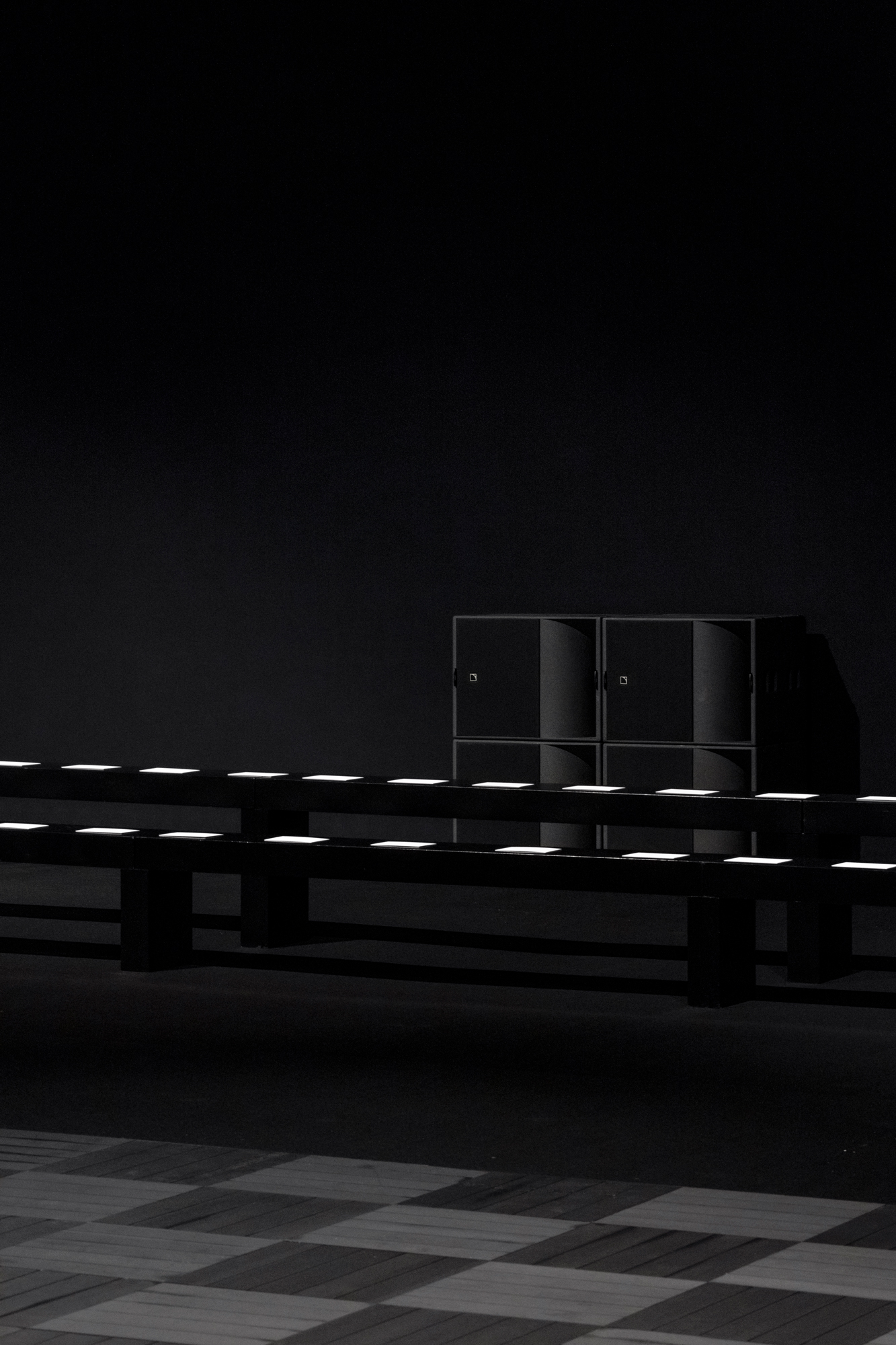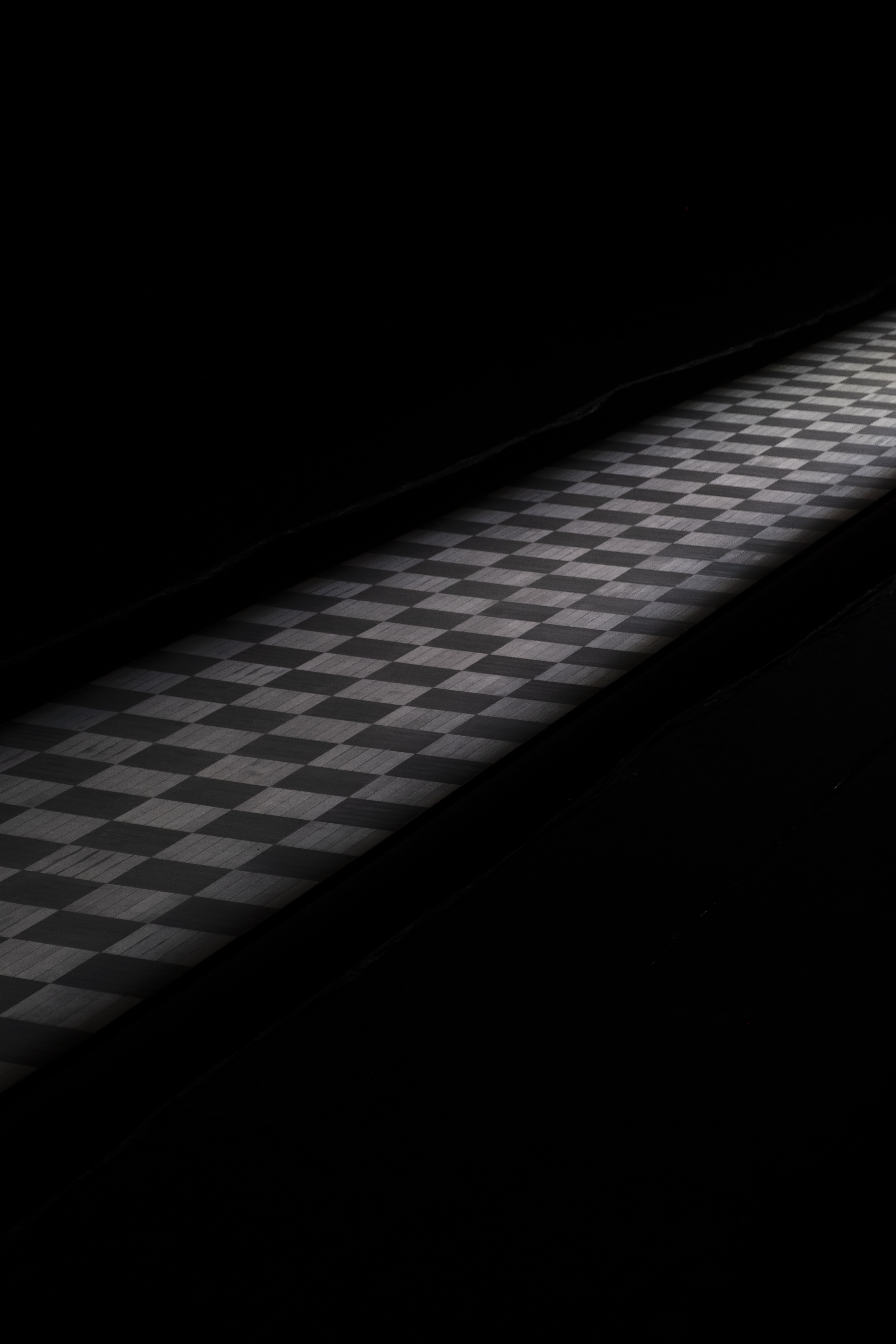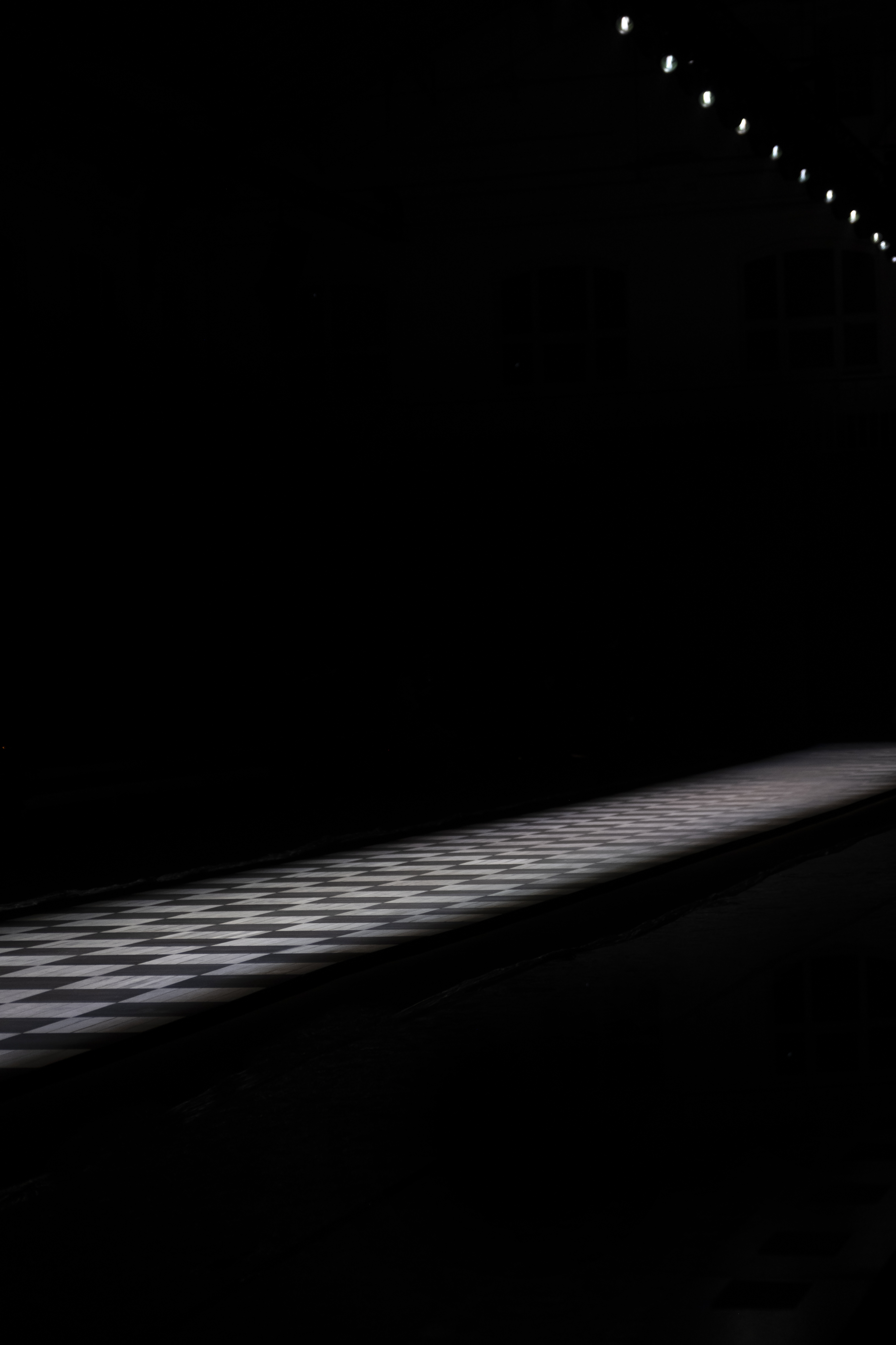 A dramatic beam of light isolates a pathway in the pitch-black hall of the Lycée Carnot, evoking the clair-obscur romance of Flemish painting. A hint of the neo-classic architecture of the school appears in the checkered wooden flooring, in a high-contrast play on post-modern juxtapositions. A ritual of revelation and disappearance, the stream of light guides the body forward, fearlessly defying the surrounding darkness.