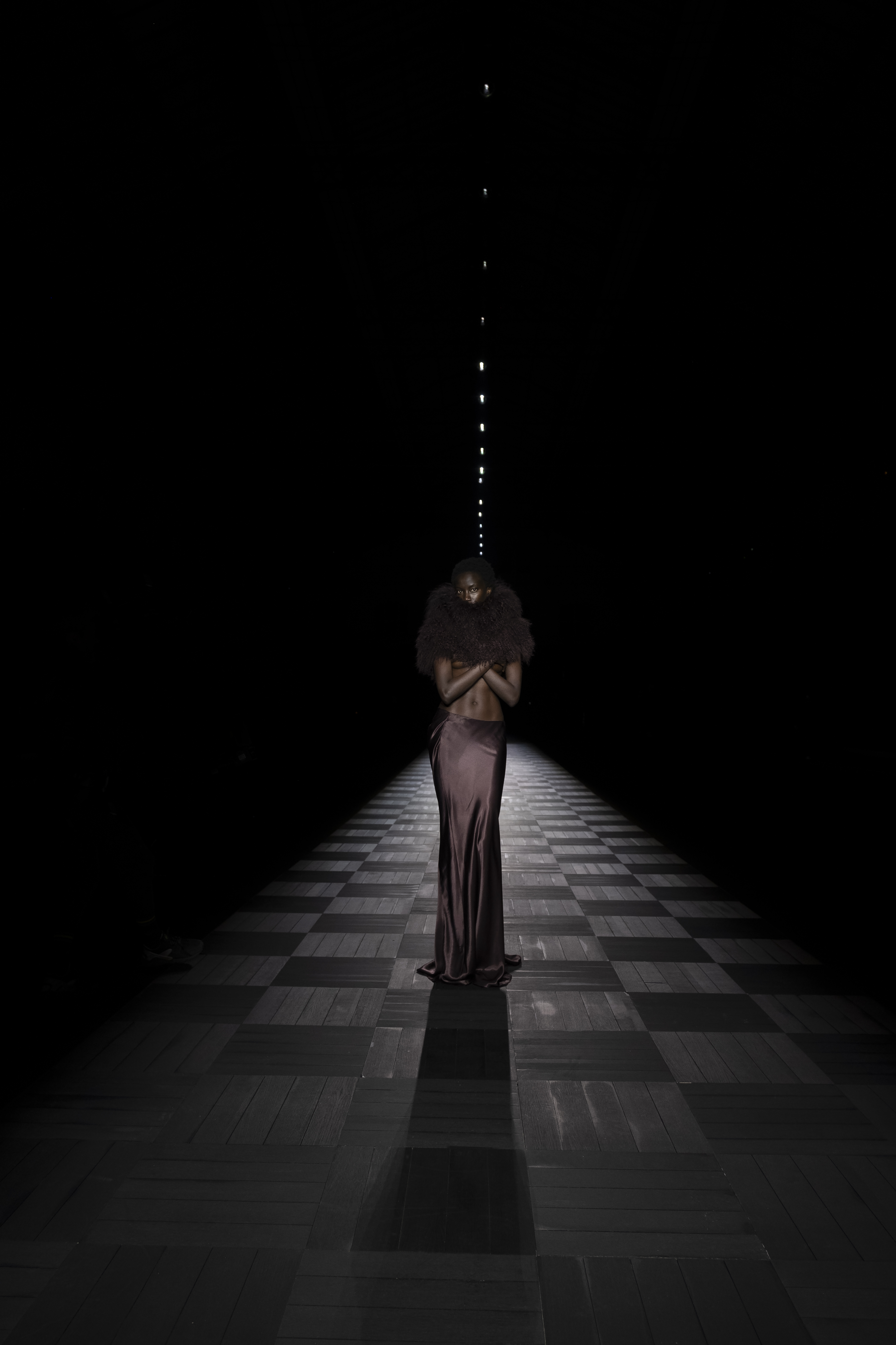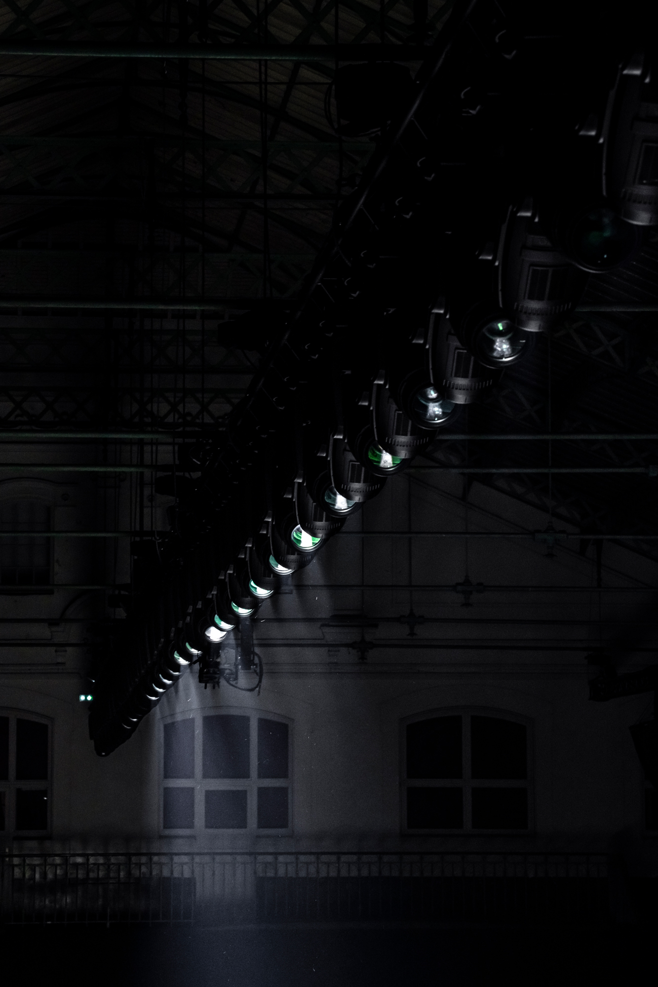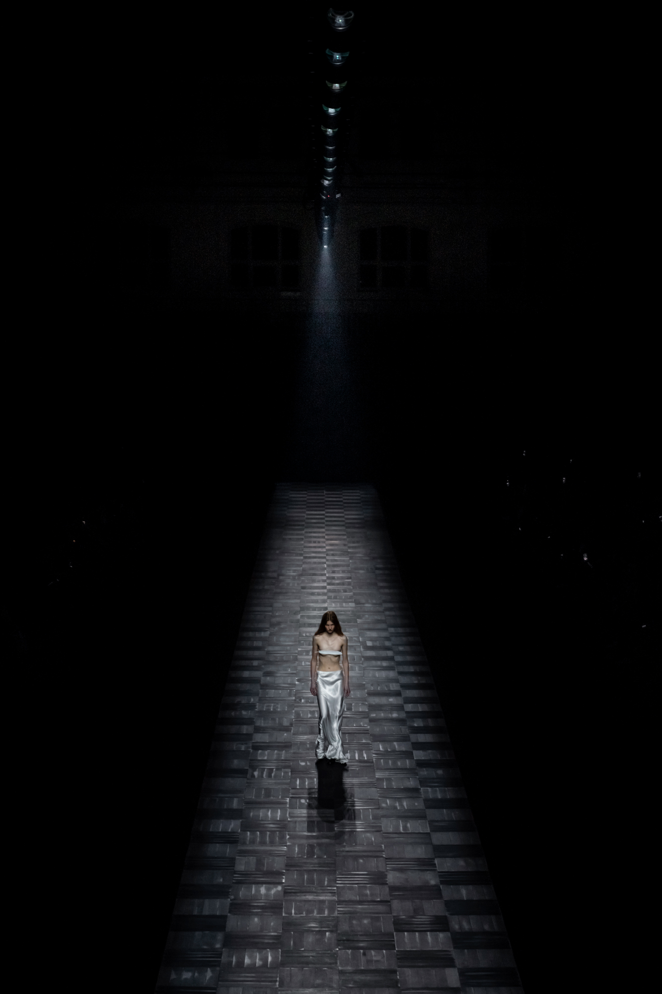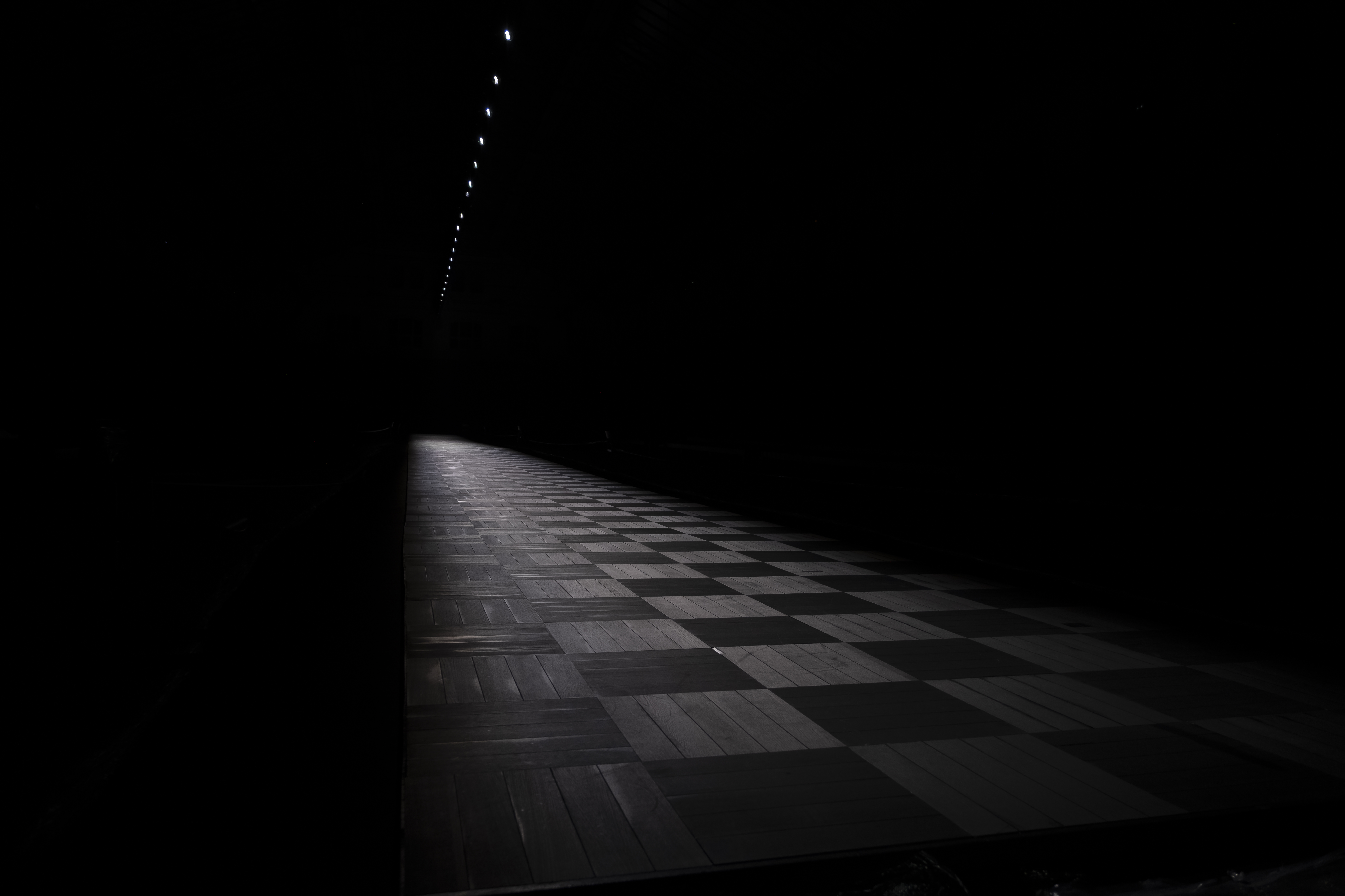 A dramatic beam of light isolates a pathway in the pitch-black hall of the Lycée Carnot, evoking the clair-obscur romance of Flemish painting. A hint of the neo-classic architecture of the school appears in the checkered wooden flooring, in a high-contrast play on post-modern juxtapositions. A ritual of revelation and disappearance, the stream of light guides the body forward, fearlessly defying the surrounding darkness.