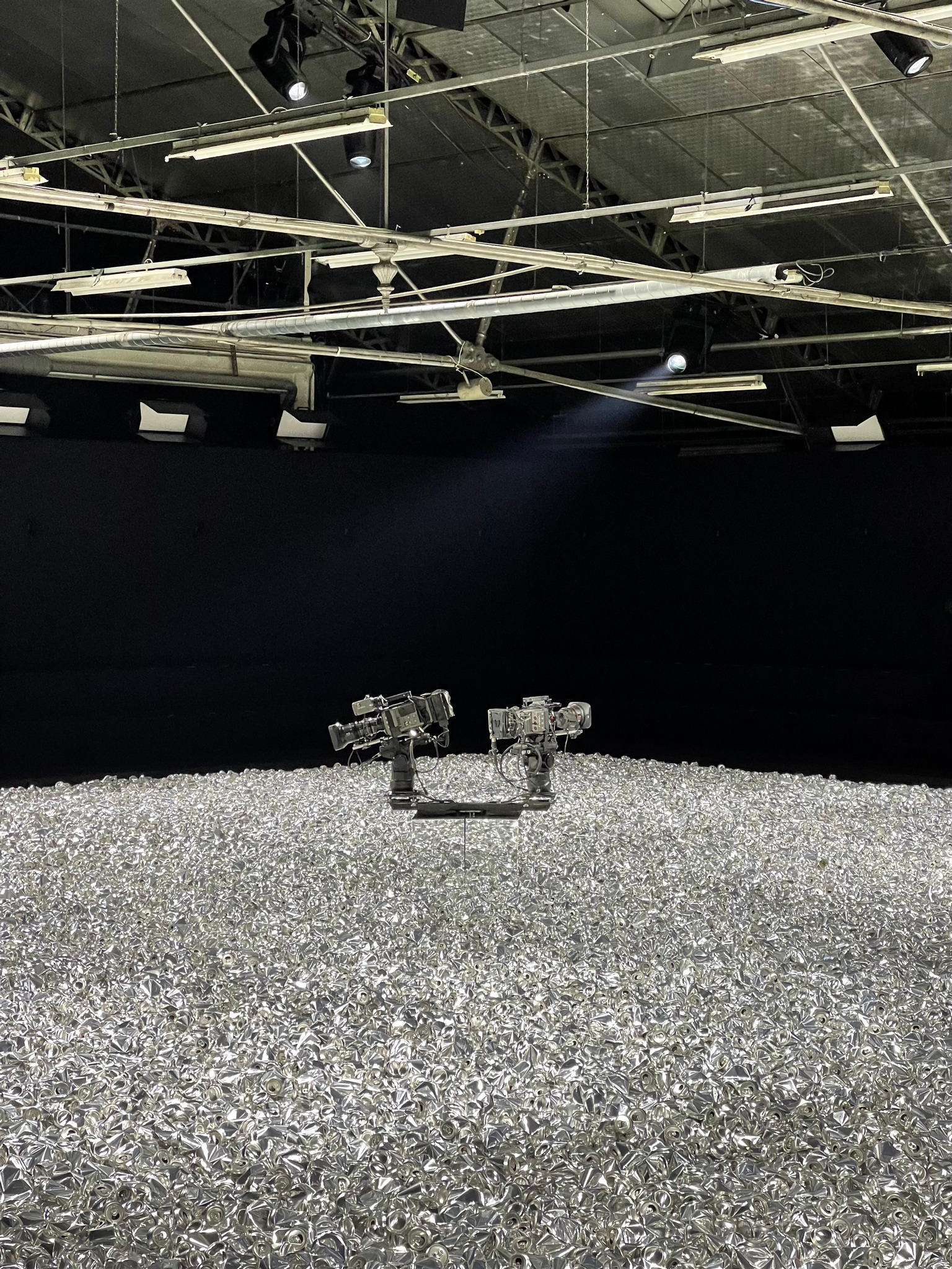 An ode to unexpected legacies of the Courrèges house, the FW’22 is flooded in a sea of silver cans, their compressed silhouettes glittering brilliantly on either side of the runway. Using classic show lights, the lighting was focused on isolating the square of accumulated cans, heightening the sculptural effect of the set designed by artist, and brand collaborator Rémy Brière.