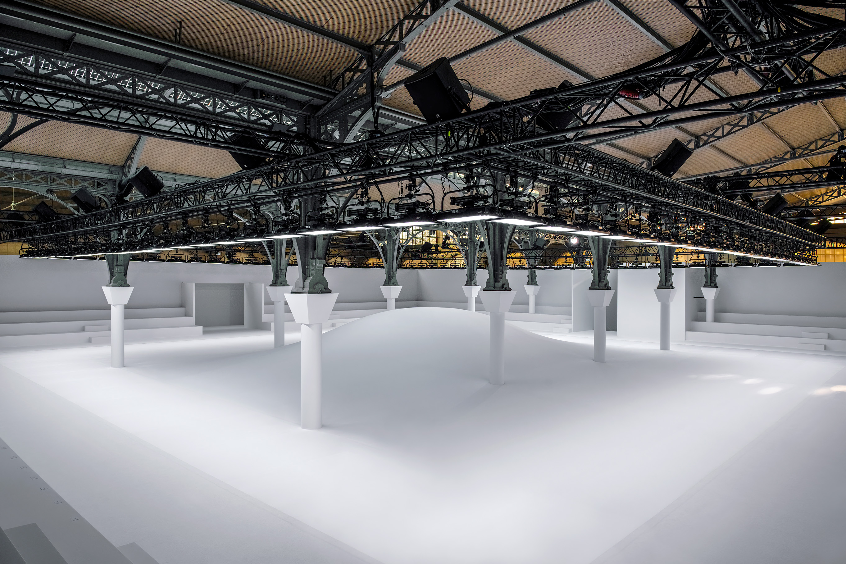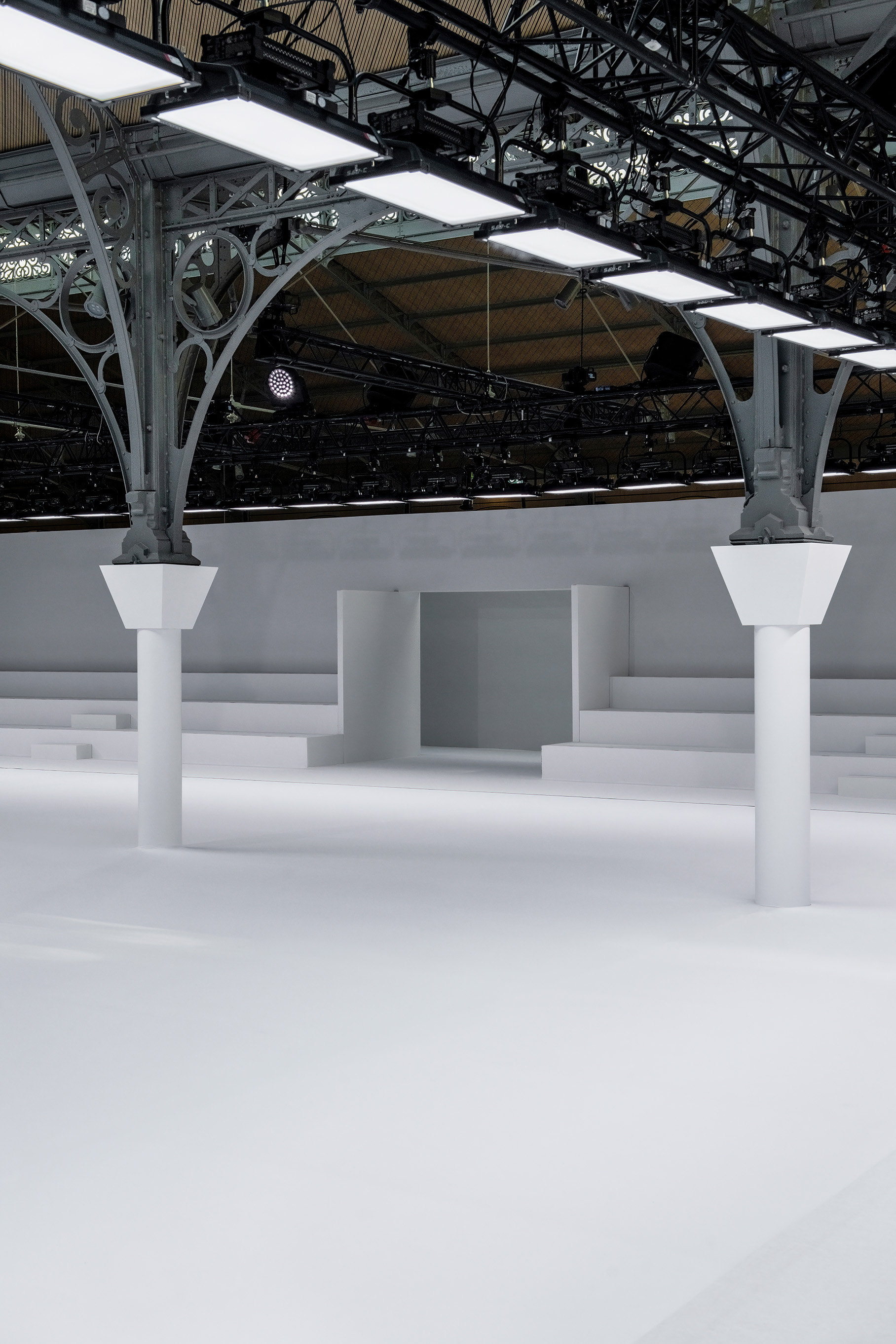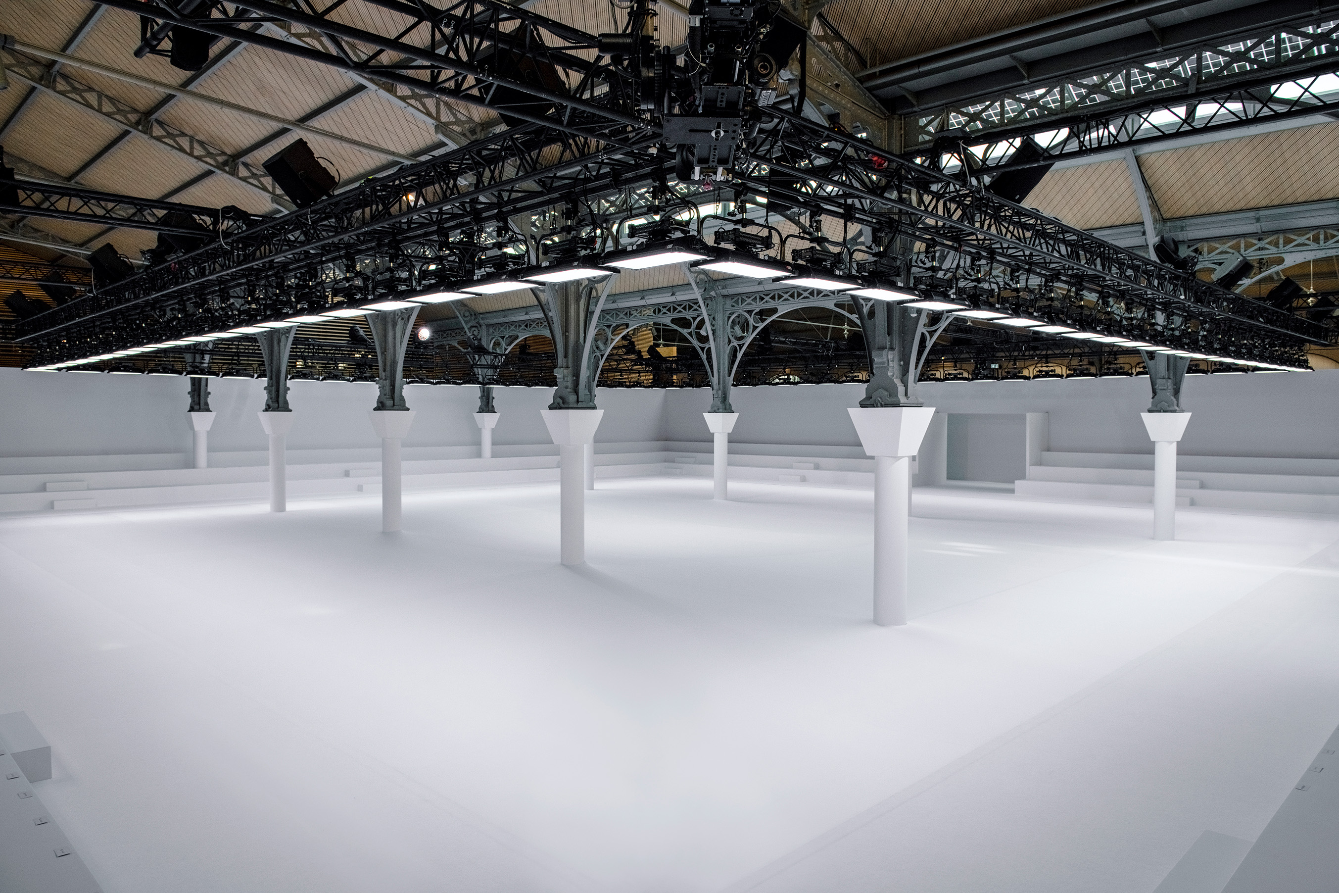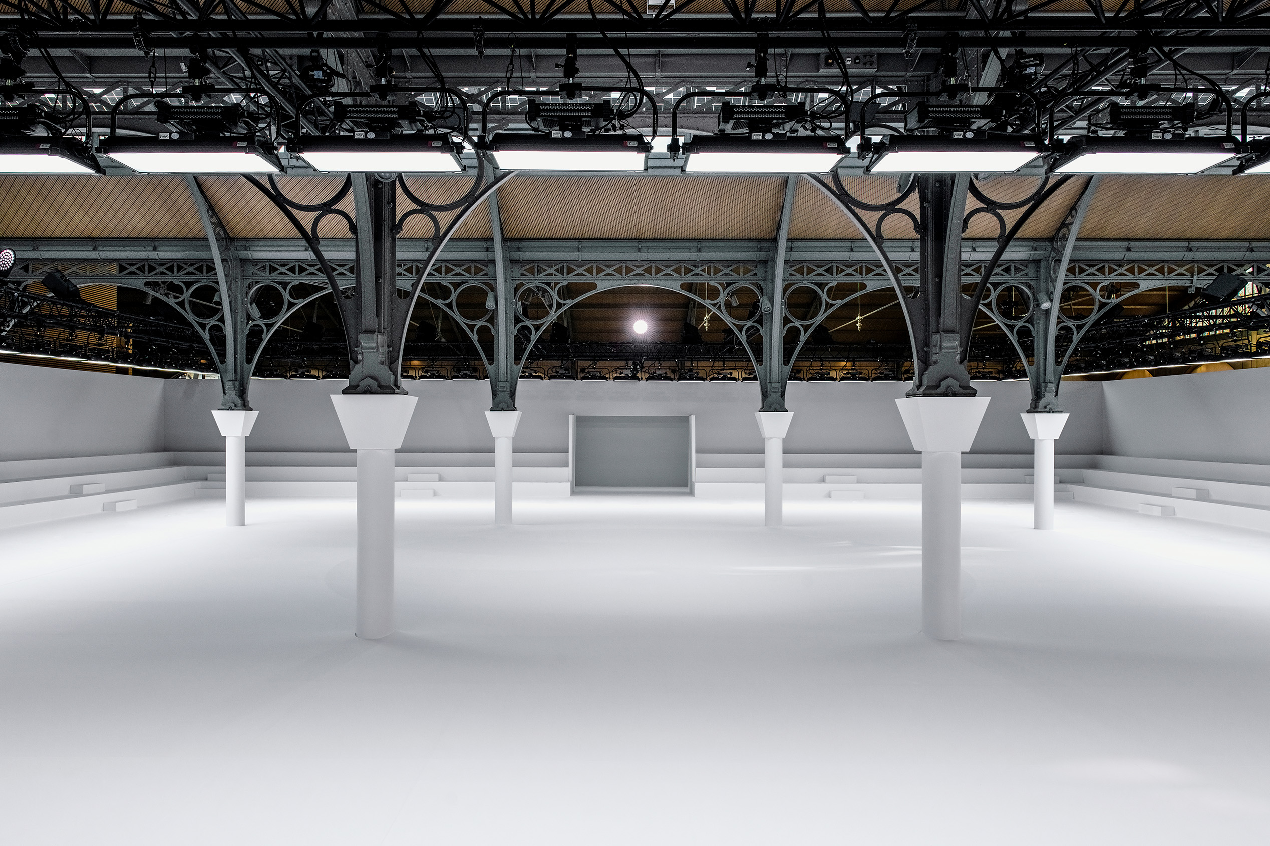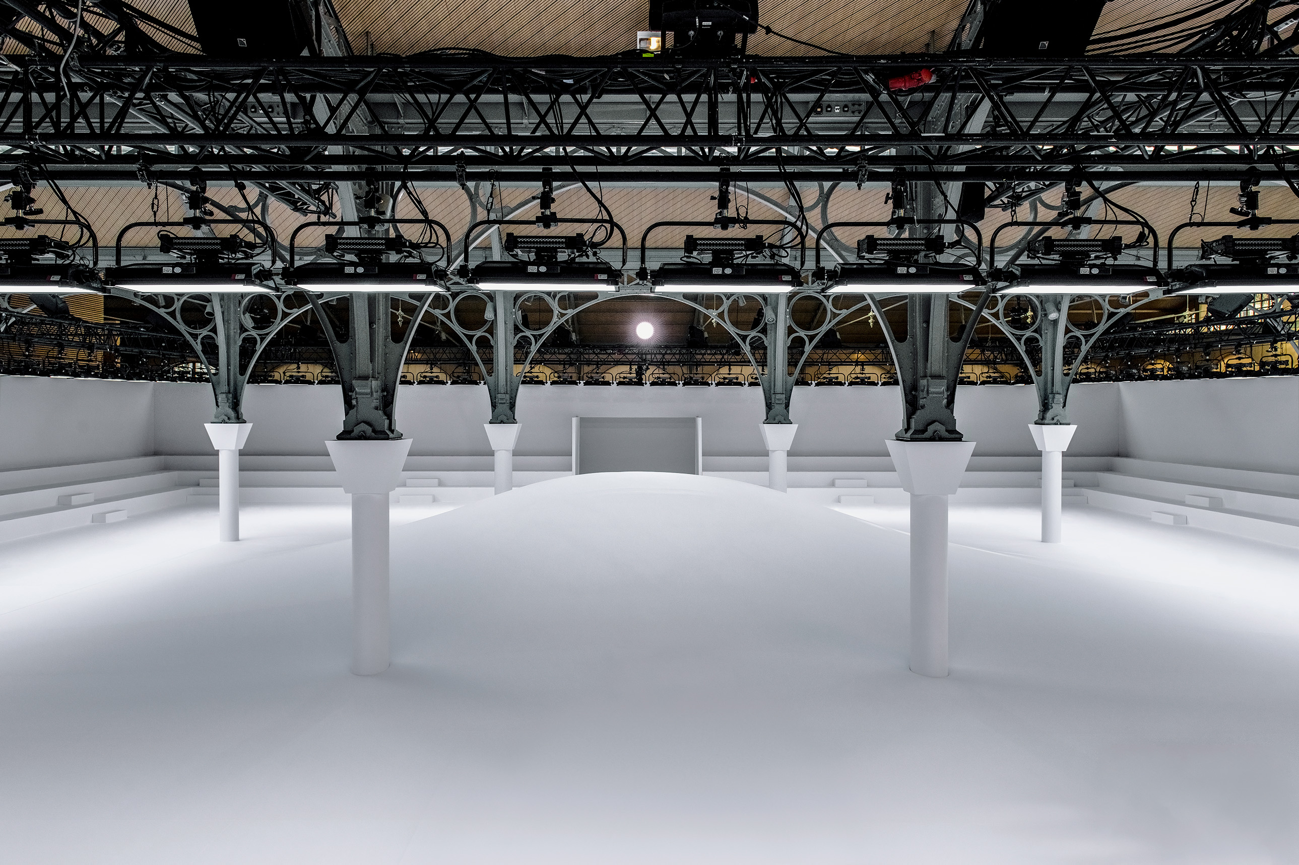 Within the subtly elevated halls of the Carreau du temple, the soothing tempo of a woman’s breath fills the space like a beating heart. ‘Take it, Take it slow’ she chants, as the silhouettes shed their protective layers. Little by little, Nicolas Di Felice’s quest for heightened emotions builds up like shivers in the surrounding scene. In a surreal chain reaction, the lycra-covered catwalk inflates like a heaving chest. Conjured by artist Rémy Brière, and creative polymaths, Matière Noire, this living, throbbing scenography is charged with a visceral energy that is driven to its unstoppable climax.