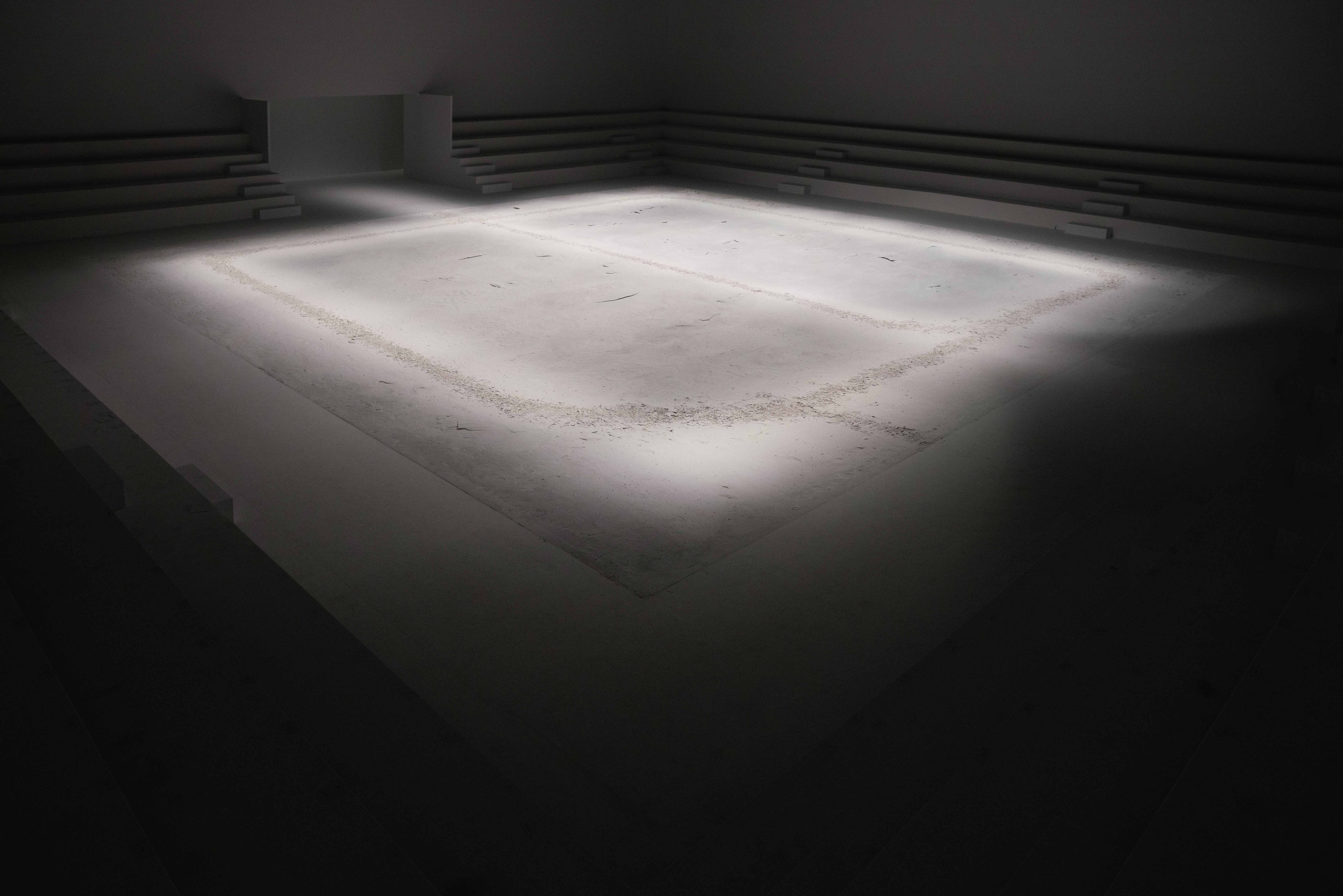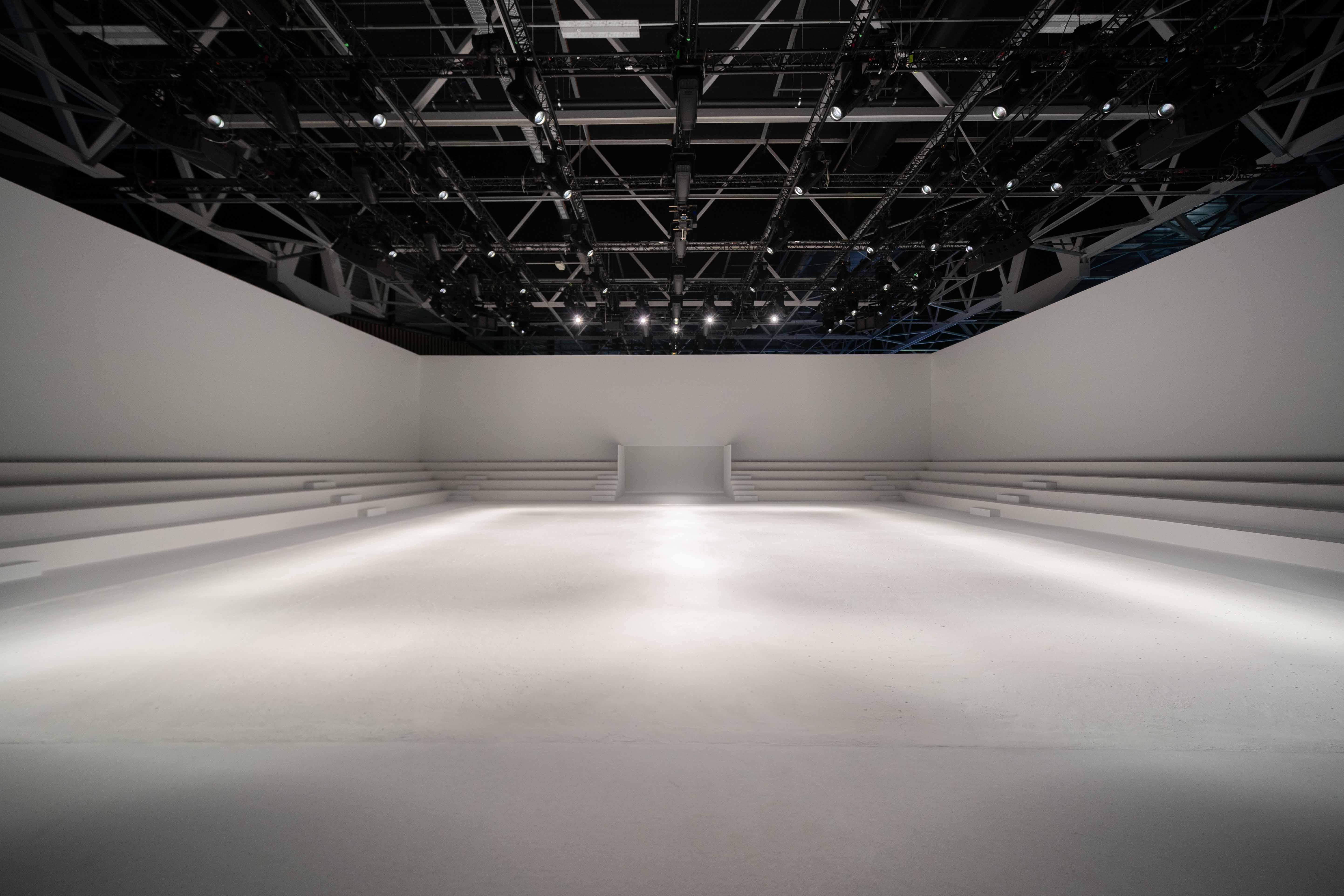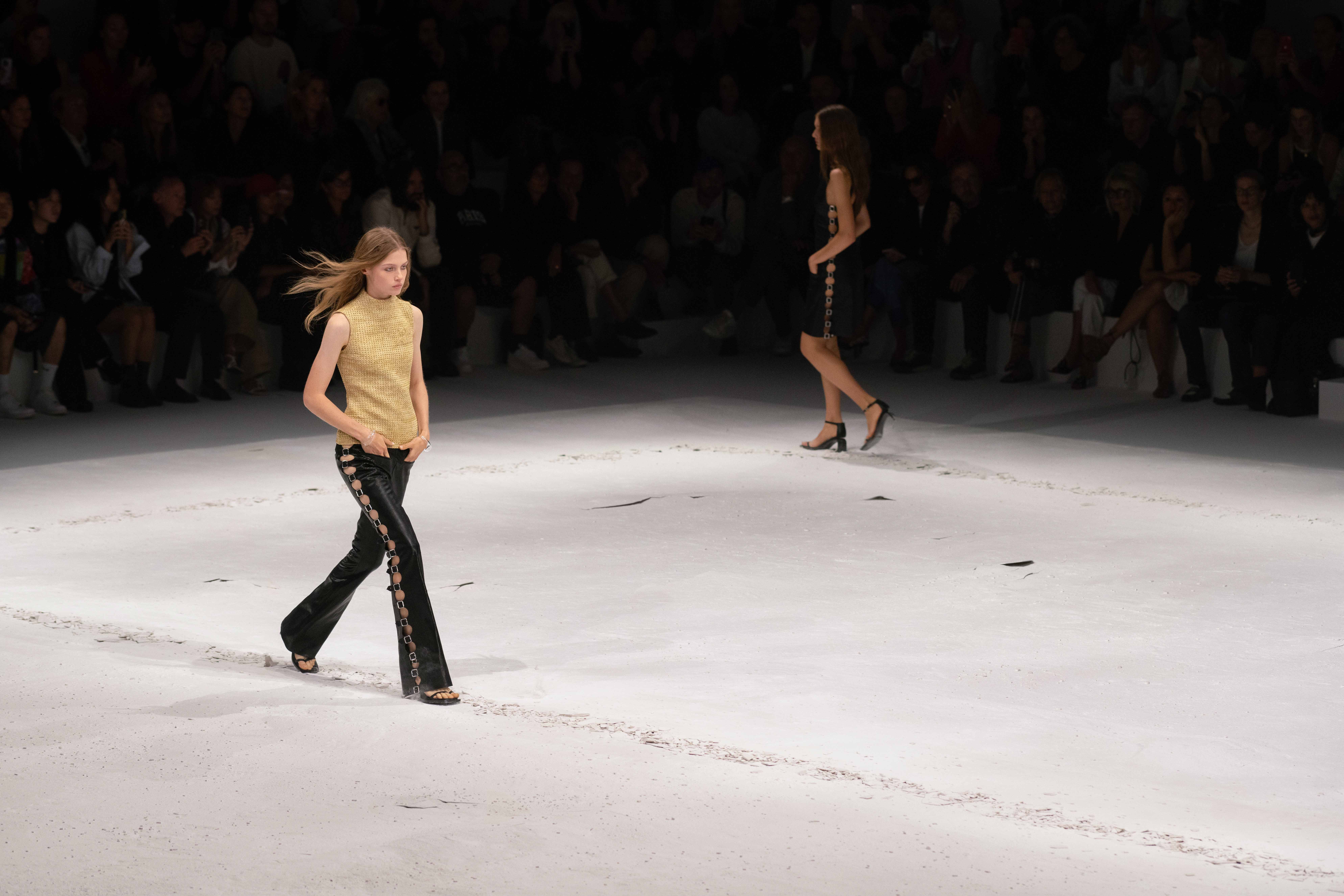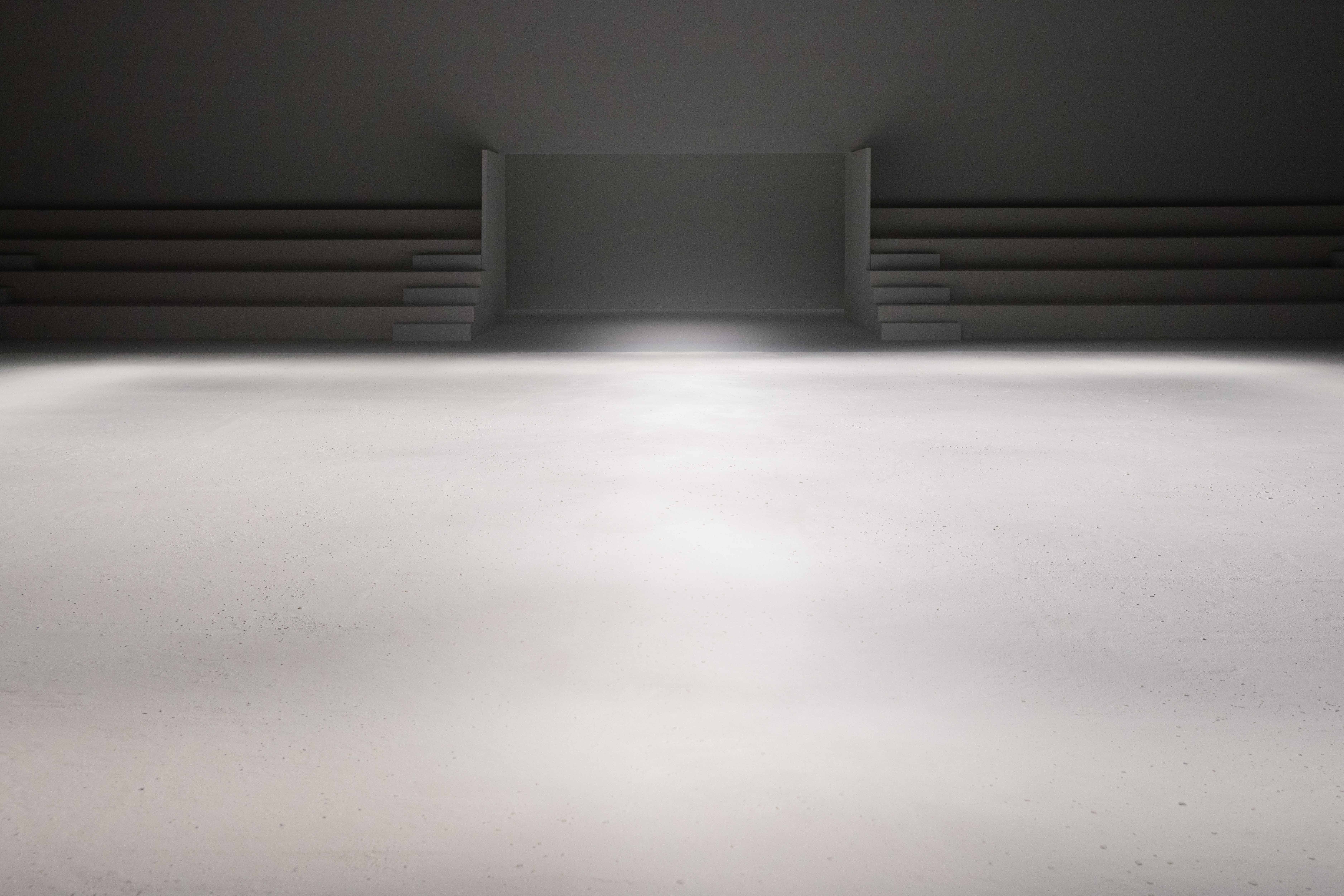 Imagined by artist Remy Brière, the set design of Courrèges’ SS’24 runway presentation is an entropic stage that takes after the strategies of Land Art, its brittle form echoing the clashing encounter of Mind and Nature. In this sculptural framework, each passing stride carves its own, accidental imprint on virgin land, fissuring an infinite path forward. From a bright light box that floods the cubic scene, streams of light emerge gradually, delineating the jagged road left behind. Flashes of artificial sunlight close the show, emphasising the cinematic intentions of the collection.