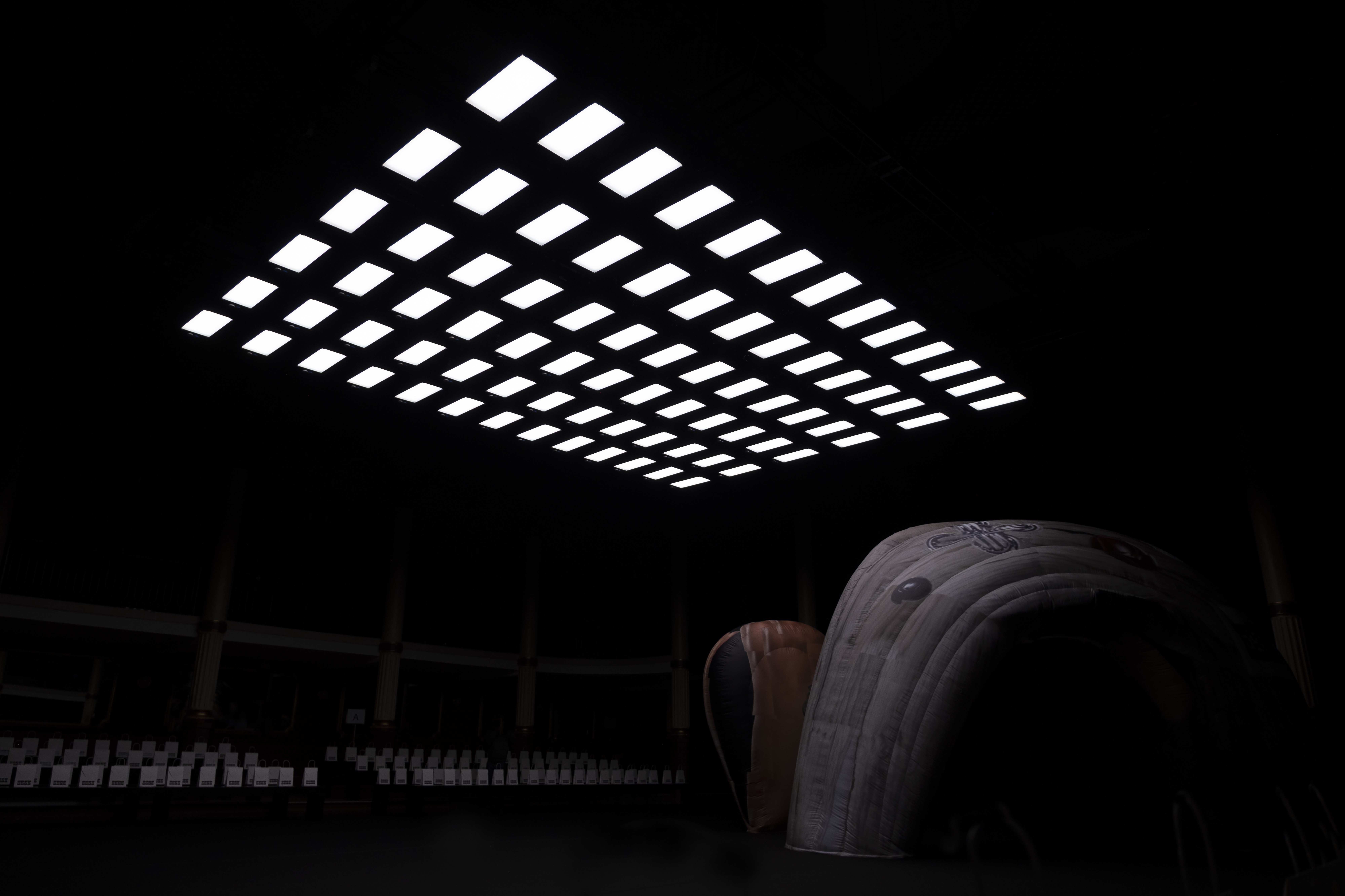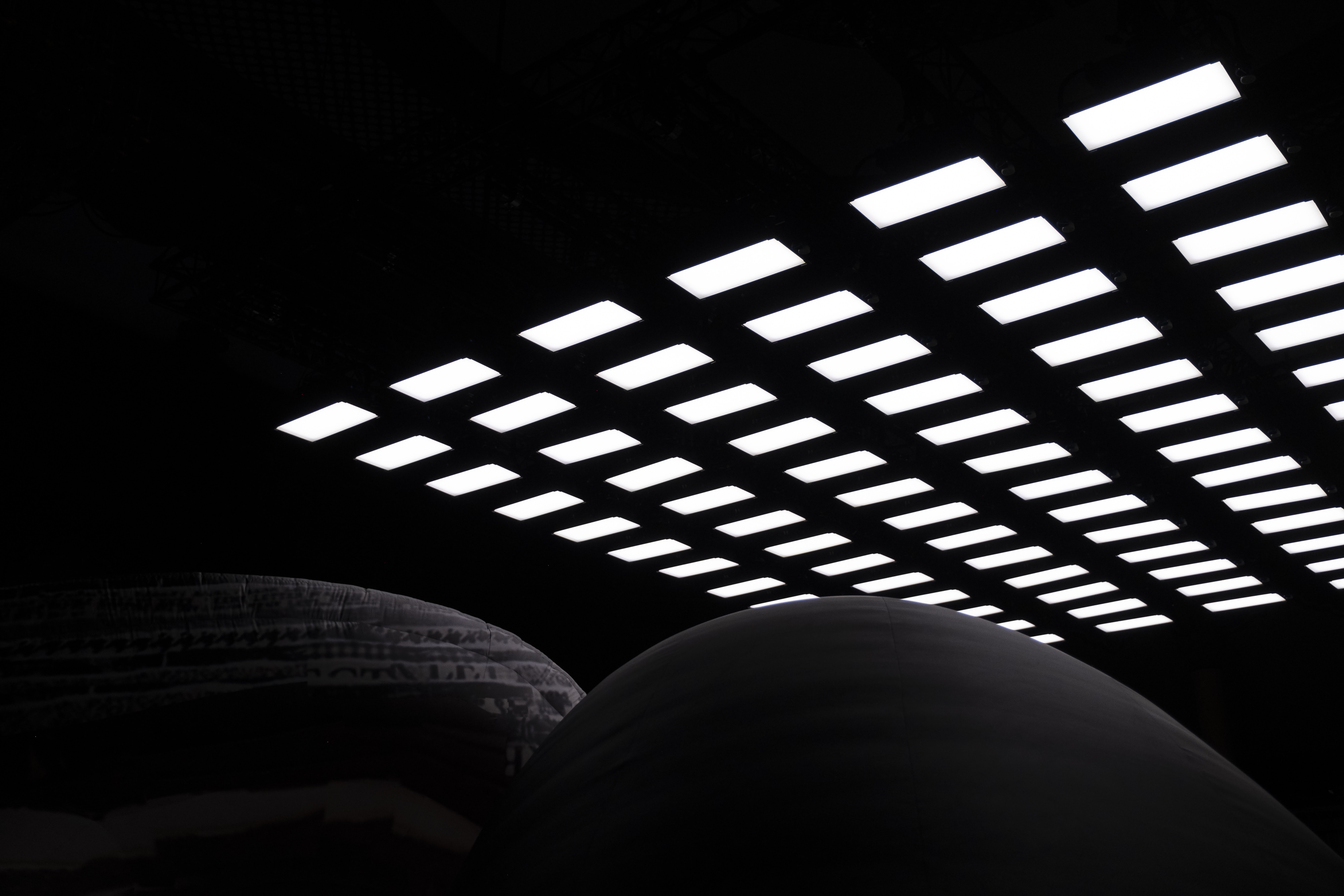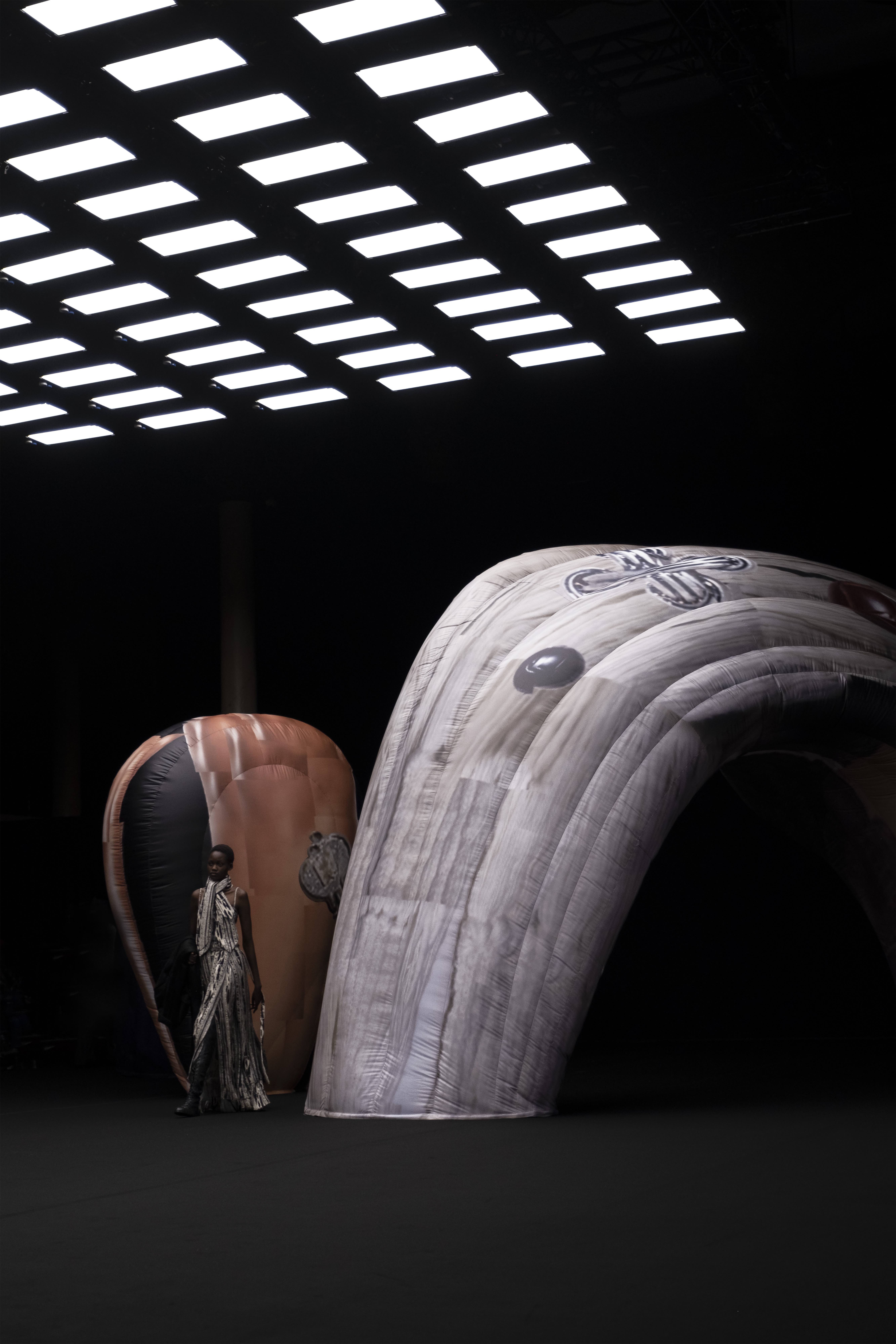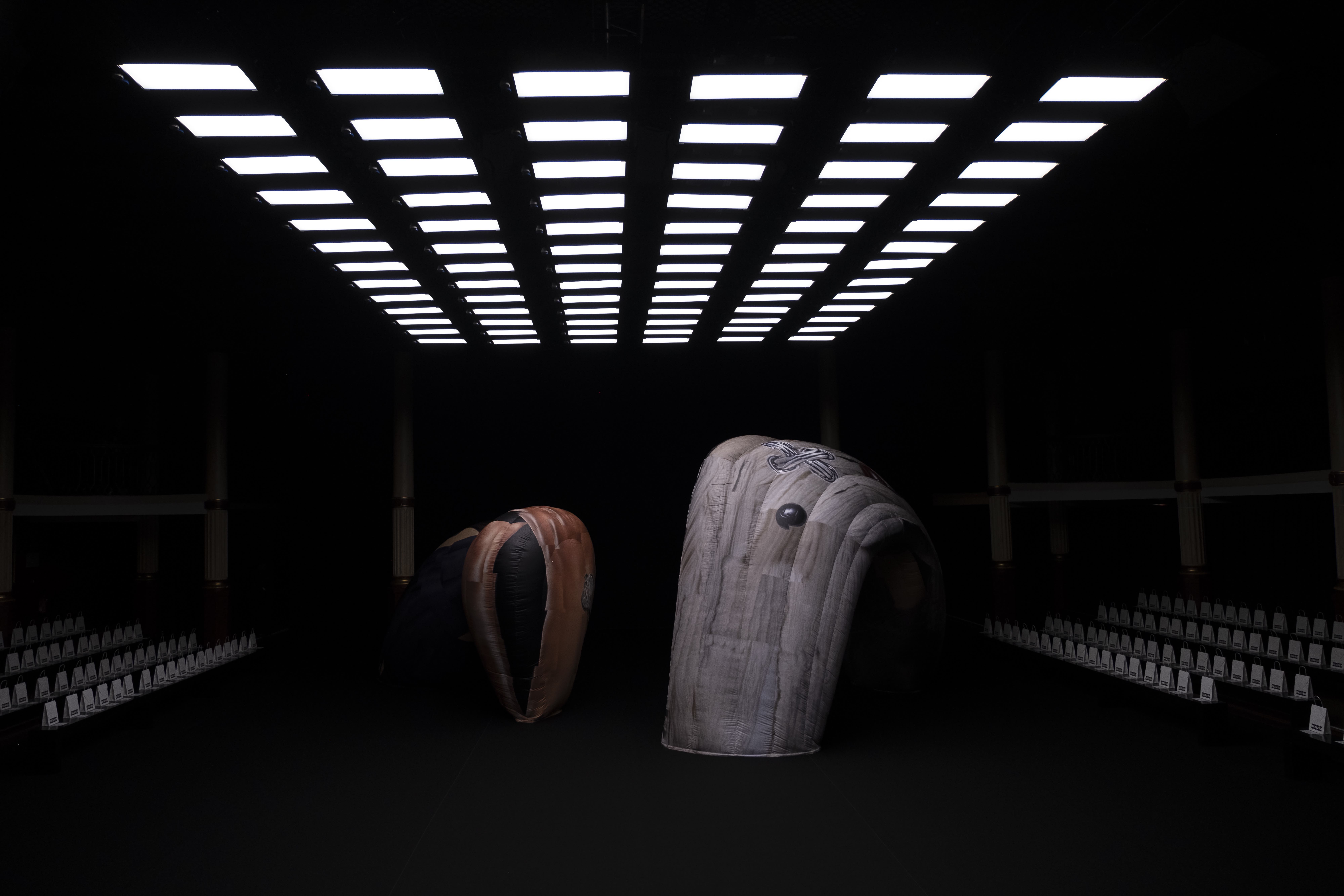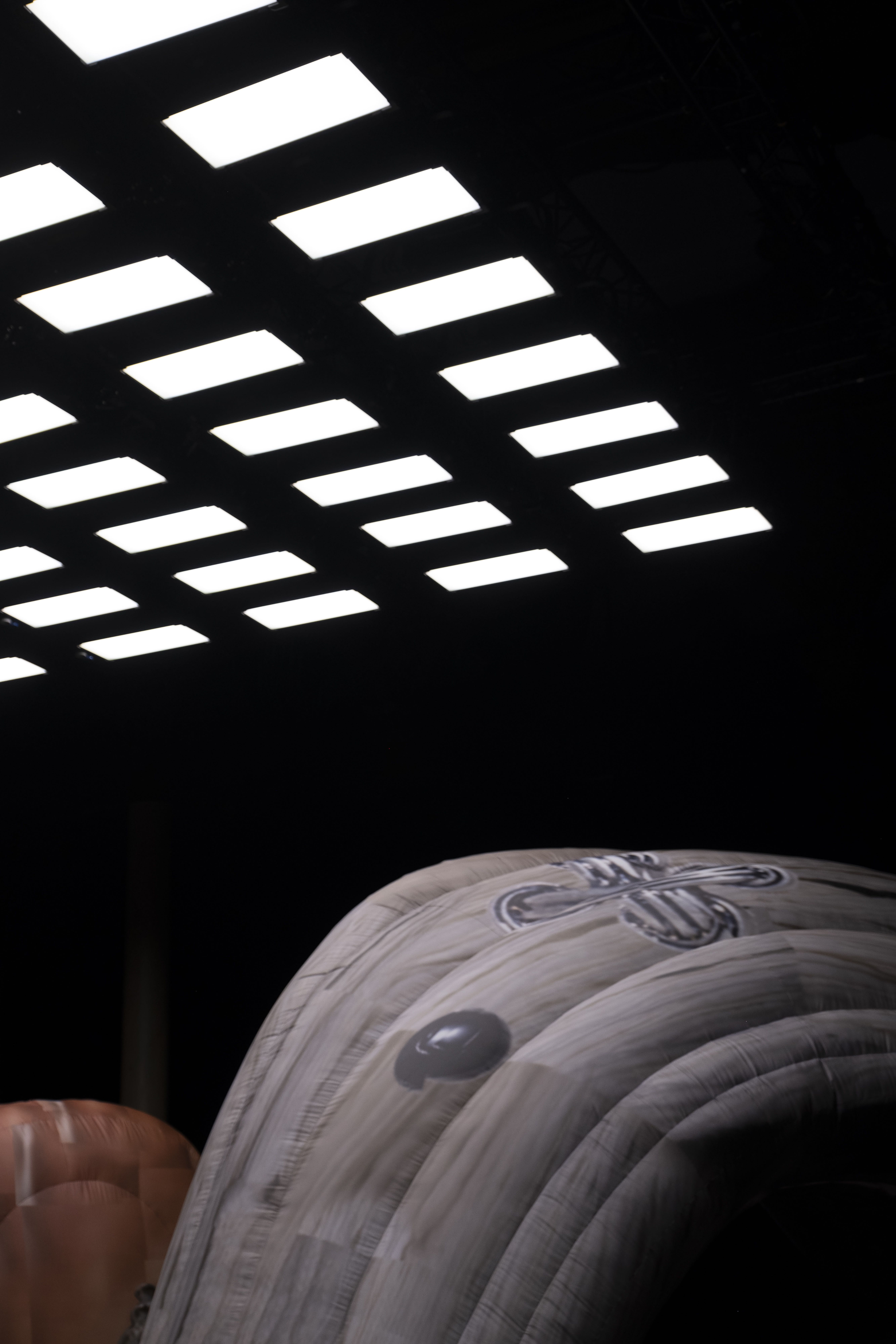 Obscuring the Haussmanian outlines of the Salle Wagram, the scenography of Eenk’s FW’23 runway presentation was built around an accumulated light source, creating a boxed-out space centered around the venue’s geometric sky-light. This stripped-back approach allowed for a surrealist dialogue between the inflated, cocoon-like sculptures in the middle of the runway and our minimalistic lighting intervention.