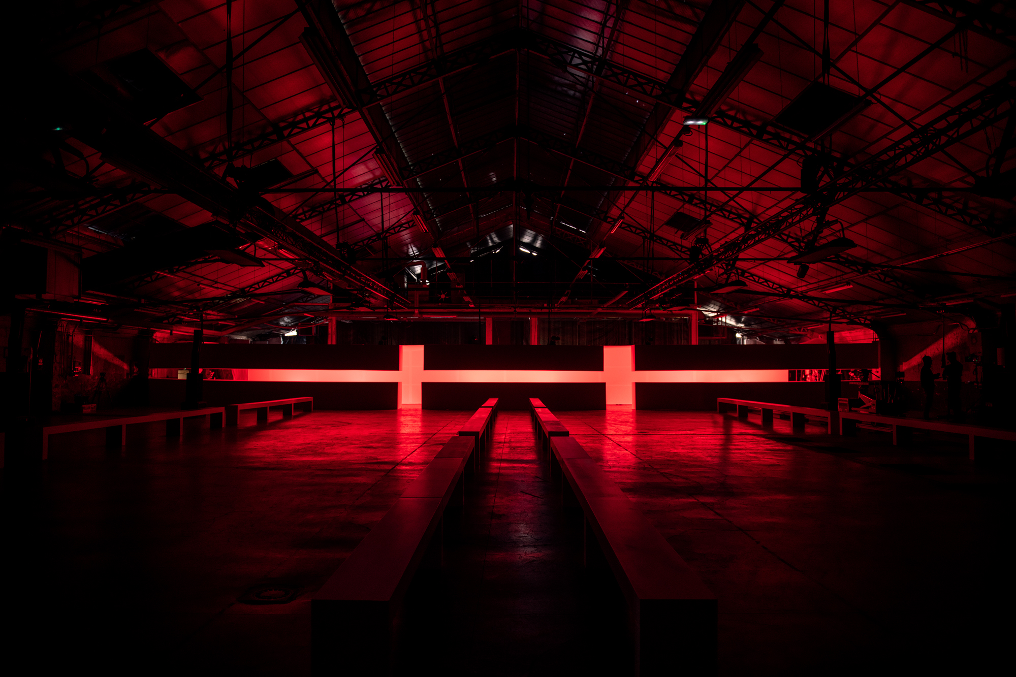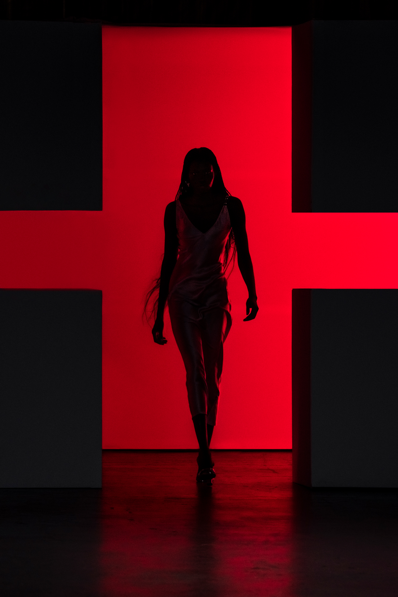 Staged in the hollow expanse of a garage, Marcia’s FW’23 runway is conceived as a fantasized party, observed longingly from the sidelines. Slit horizontally, a built-in structure holds the audience at tense distance, creating mystery and anticipation around the incoming procession of lightly-clad night sirens. A minimal and timeless formal approach creates cinematic focus on the scene, nodding subtly to the iconic cut-outs that characterise the brand’s signature party dresses, revealing and exposing just enough to captivate the eye.