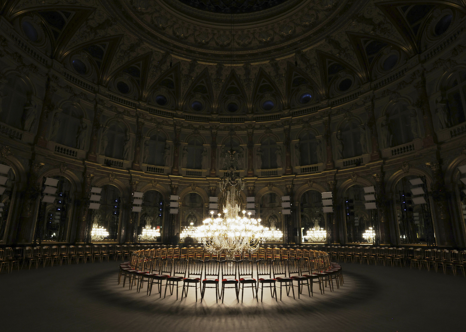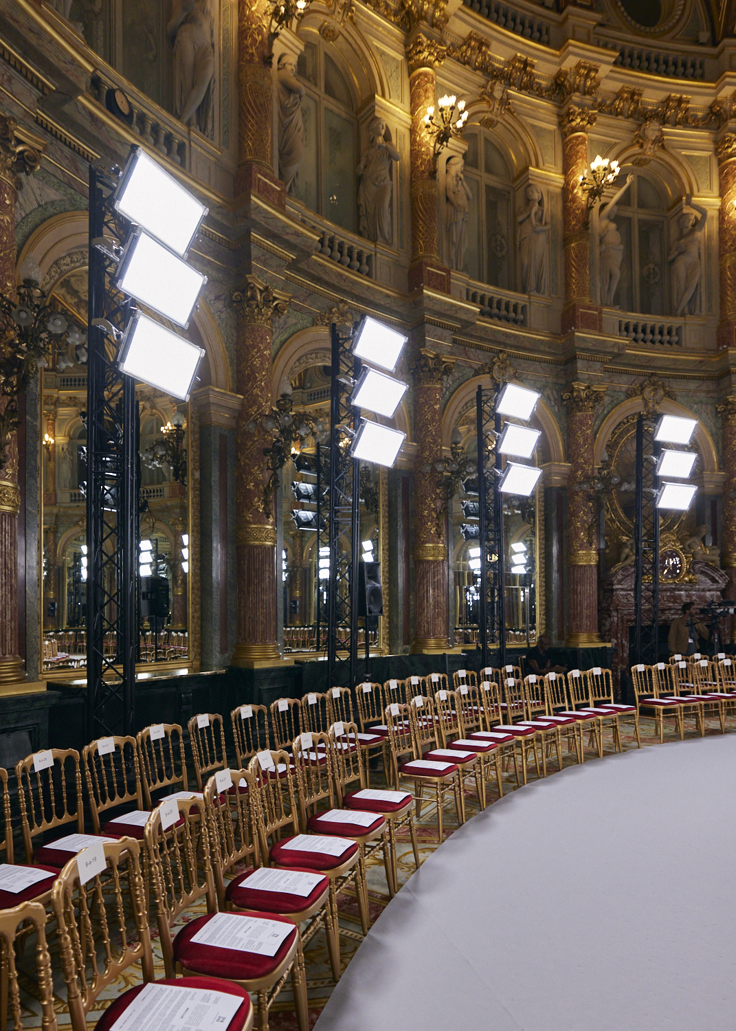 Held at Paris’ Intercontinental Hotel, Miaou’s SS’24 presentation builds on the anachronistic tension between the space’s classical setting and a hypercontemporary approach to light. Embracing the circular shape of the space, the runway is fitted with motorised lights that move cyclically through the show, creating an impression of perpetual motion. As the rhythm intensifies, an opulent crystal chandelier at the center of the room comes to life, dipping dramatically to the audience’s level. Like a twisted fairytale, the show’s theatrical scenography reflects on the Miaou girl's multifaceted and rebellious nature.