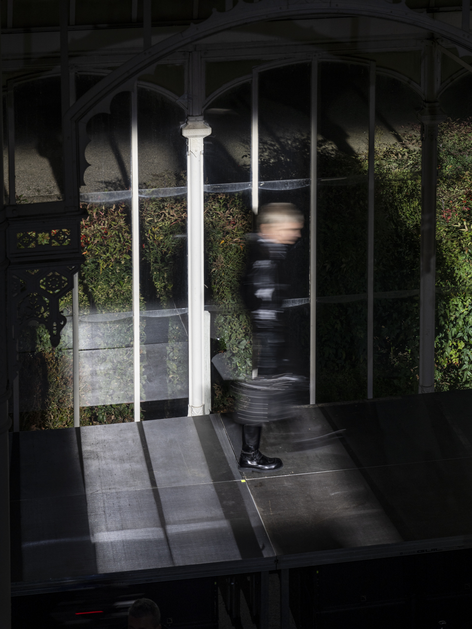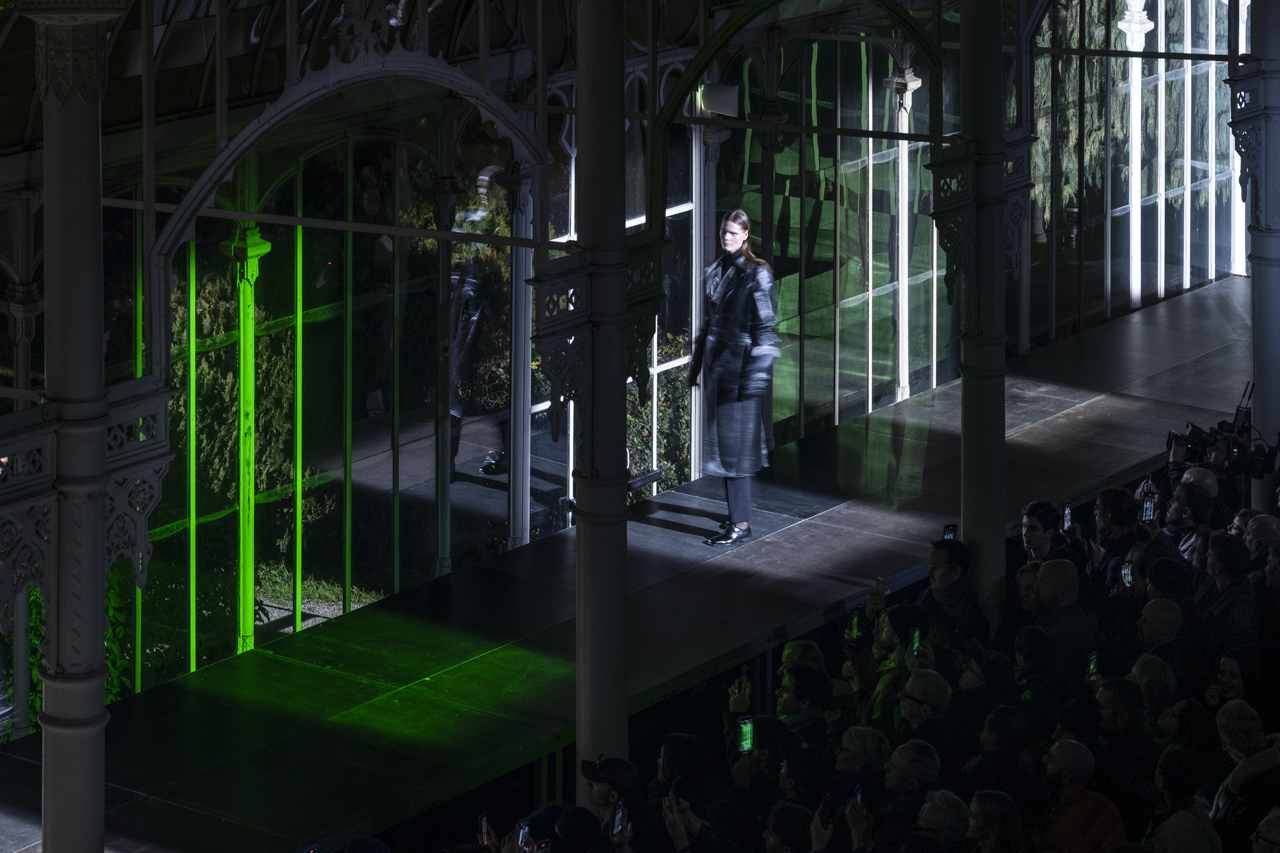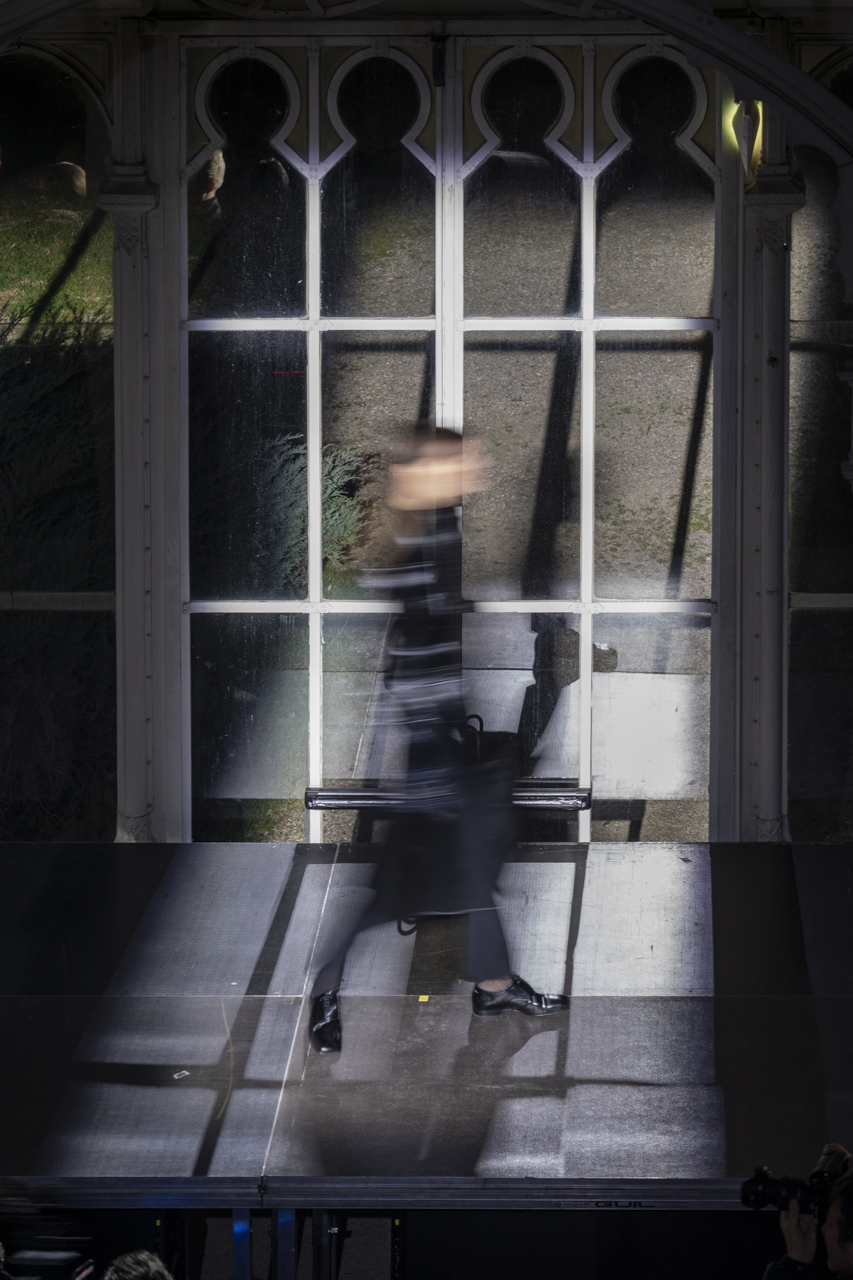 Within Florence's historic greenhouse, the installation transforms existing windows into a palimpsest of light and shadow. Each window overlay creates new architectural meaning, where boundaries between interior and exterior, past and present, become deliberately ambiguous. The colorimetric intervention operates as a temporal editing system, altering the visual DNA of each garment through zones of chromatic intensity. Models materialize, and dematerialize within alternating colour fields that evoke the frames of a roll of film. The light design creates simultaneous realities - warm amber hues evoke botanical heritage, while cool LEDs speak to Margiela's muted futurism.