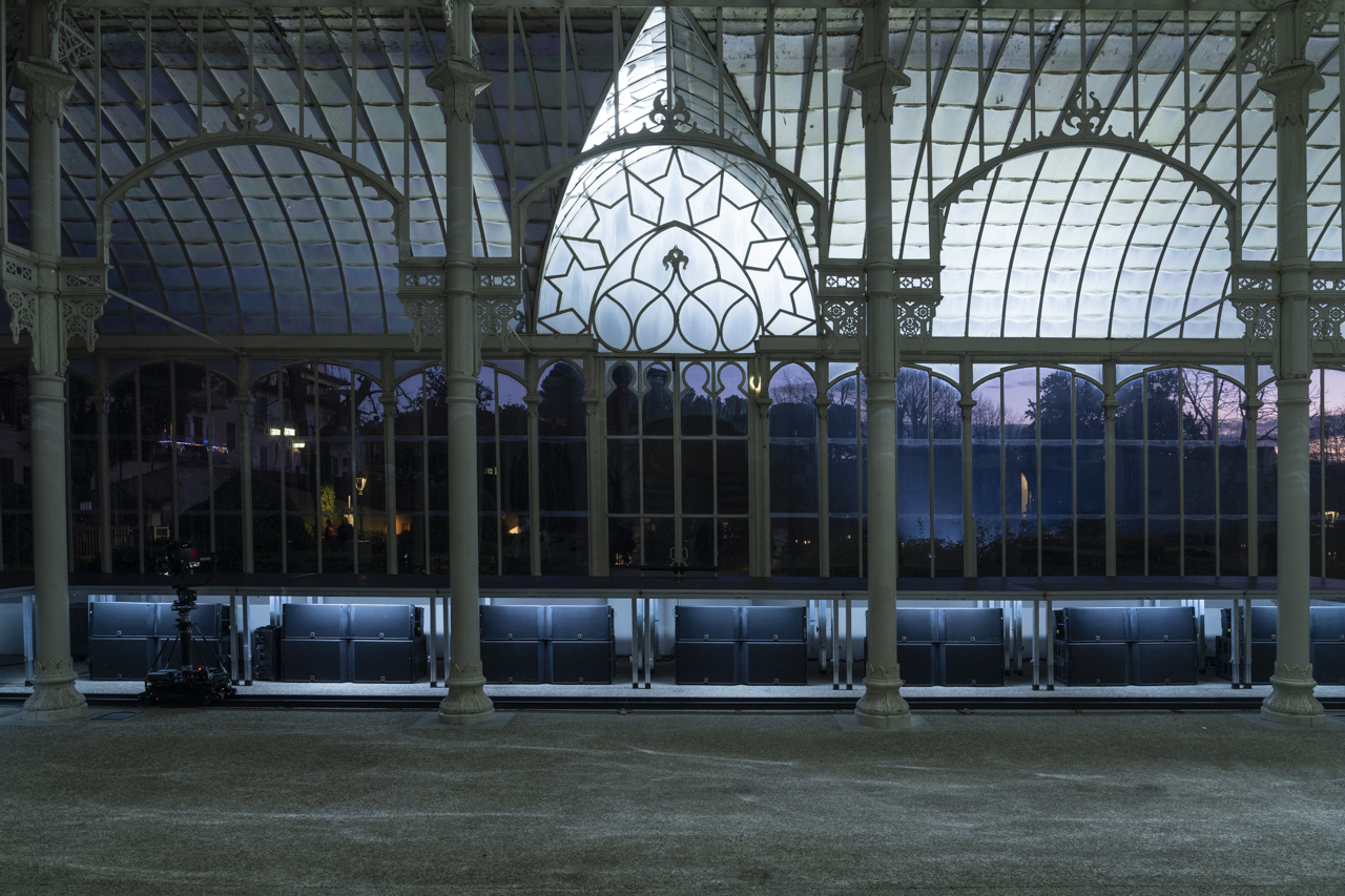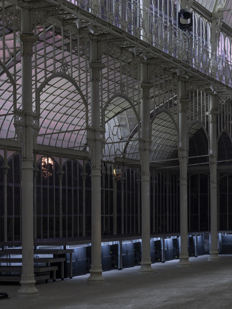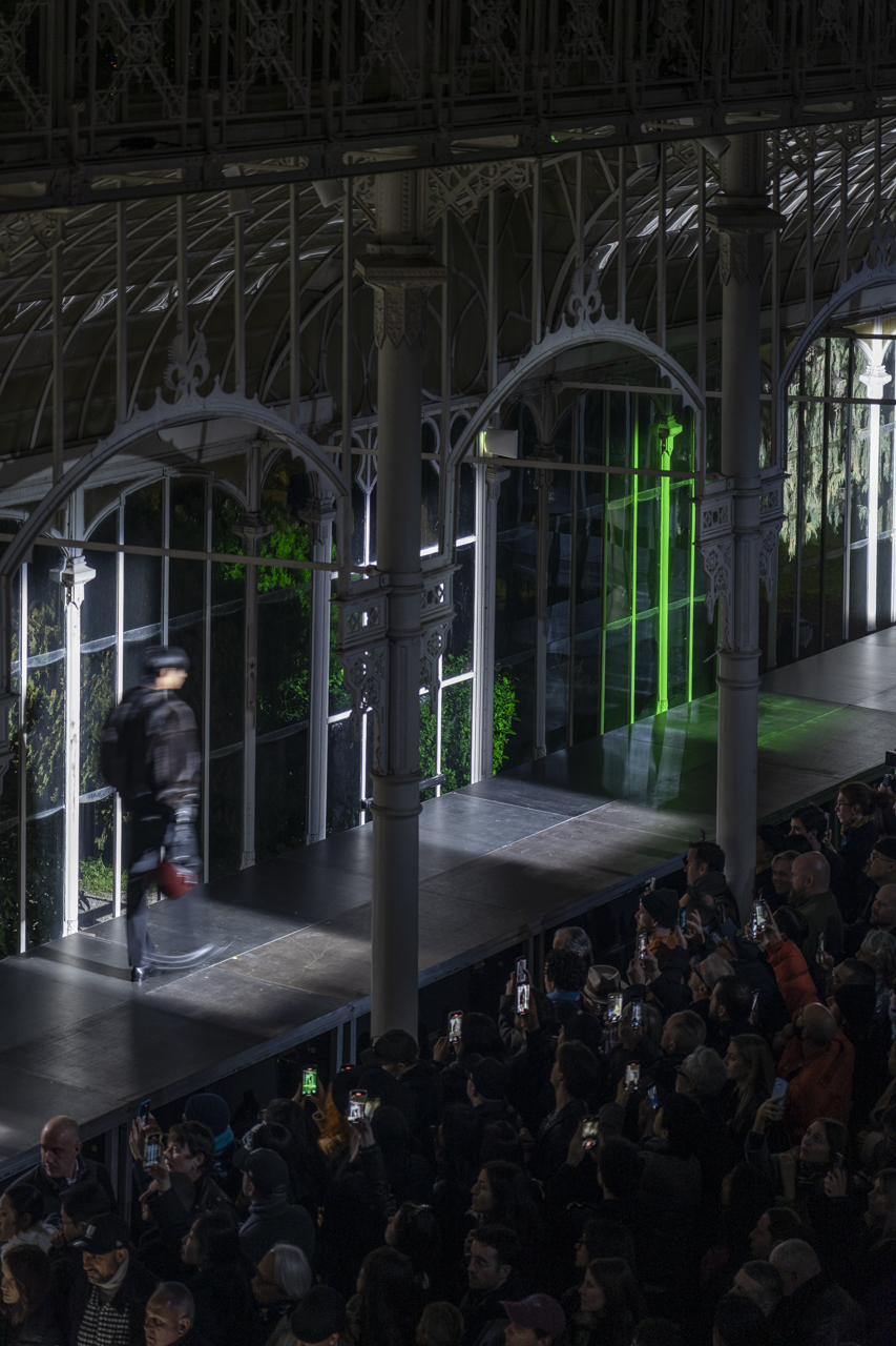 Within Florence's historic greenhouse, the installation transforms existing windows into a palimpsest of light and shadow. Each window overlay creates new architectural meaning, where boundaries between interior and exterior, past and present, become deliberately ambiguous. The colorimetric intervention operates as a temporal editing system, altering the visual DNA of each garment through zones of chromatic intensity. Models materialize, and dematerialize within alternating colour fields that evoke the frames of a roll of film. The light design creates simultaneous realities - warm amber hues evoke botanical heritage, while cool LEDs speak to Margiela's muted futurism.