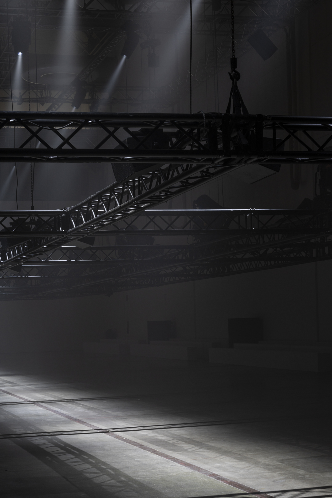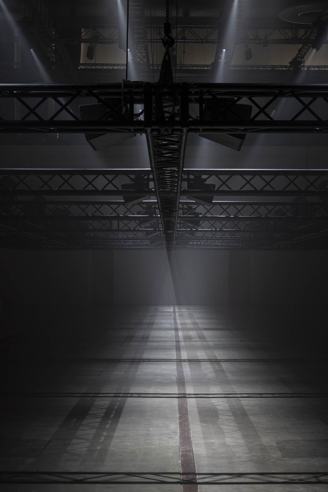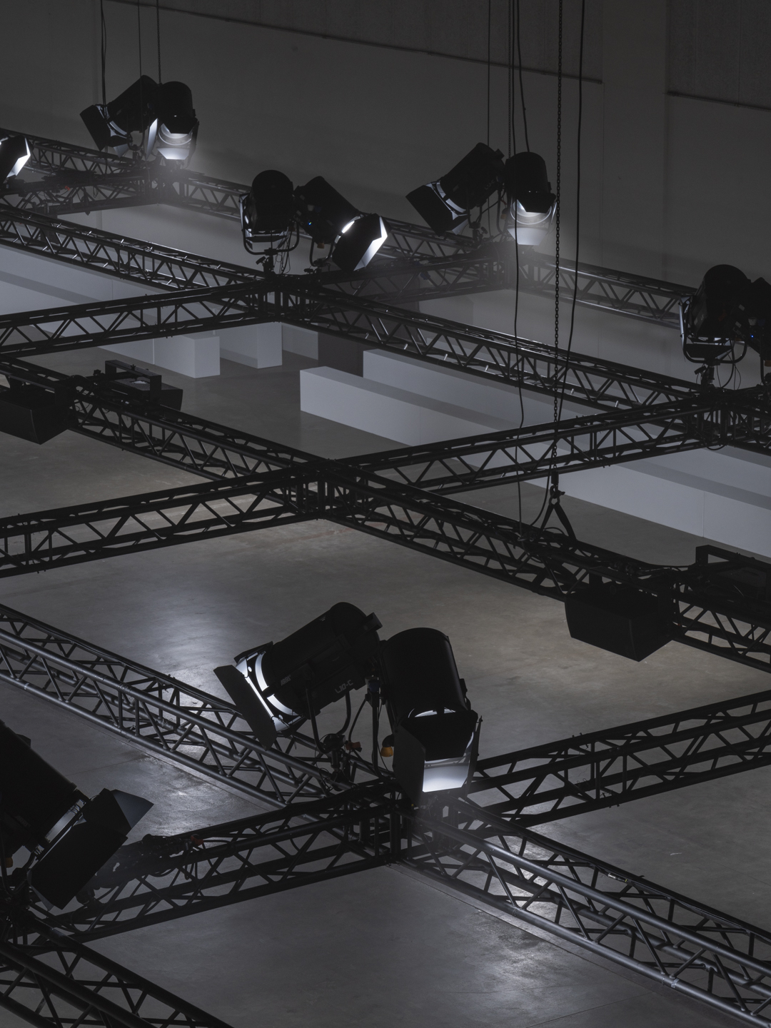 The first collaboration between Matière Noire and Maison Margiela, the scenography and light design of the SS’25 presentation stages a discrete and intangible game of shadows and constriction serving the quiet elegance of the collection. Taking the blank canvas of the location as its starting point, the proposition builds on a sober reinterpretation of the essentials of scenography, using technical light systems as architectural elements. Haunting the raw set, a first light rig hangs low from the ceiling, enclosing the space and casting a strong warm light on the passing models, while a second structure floats higher, emitting a colder hue that traces abstract shadows on the barren runway.
