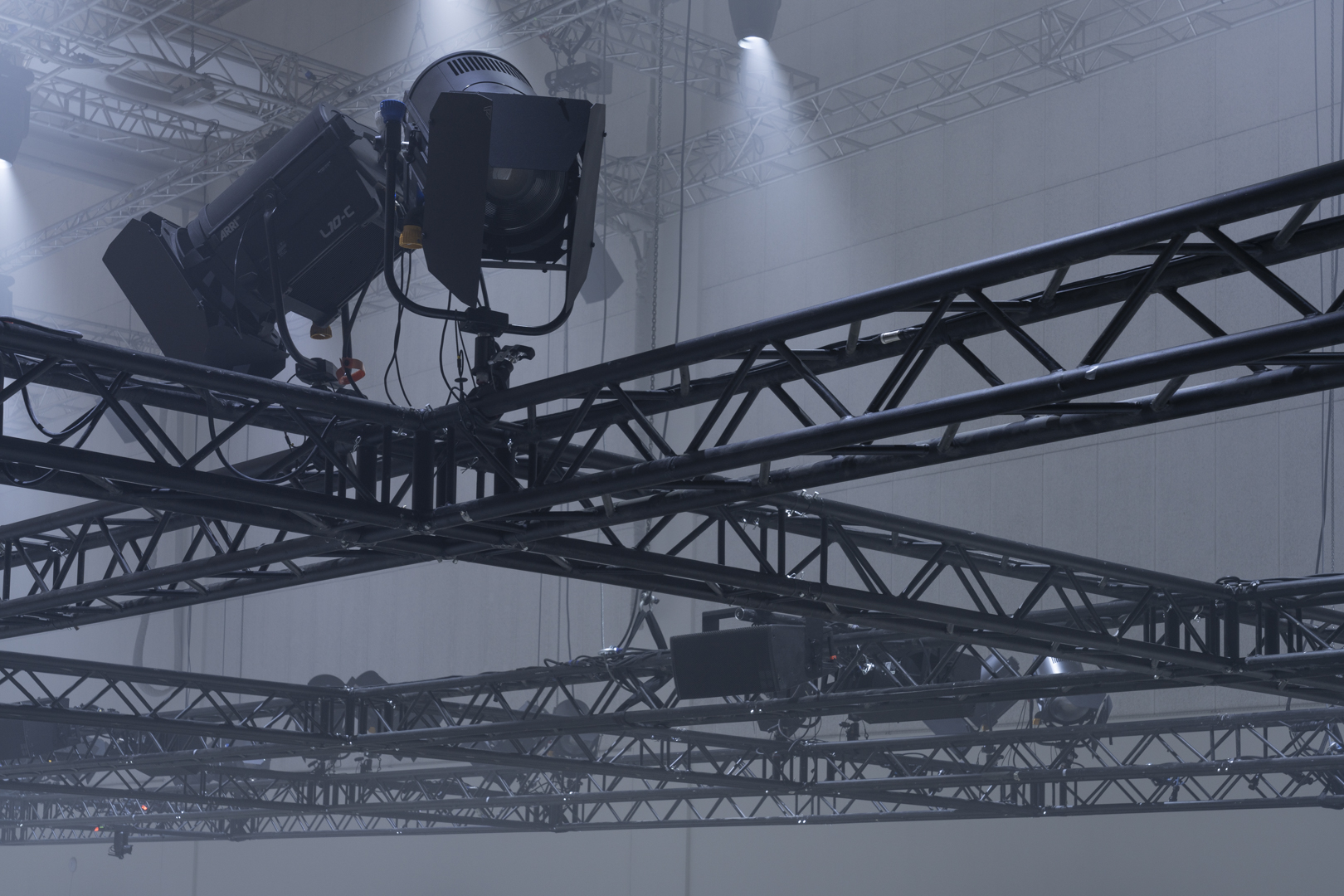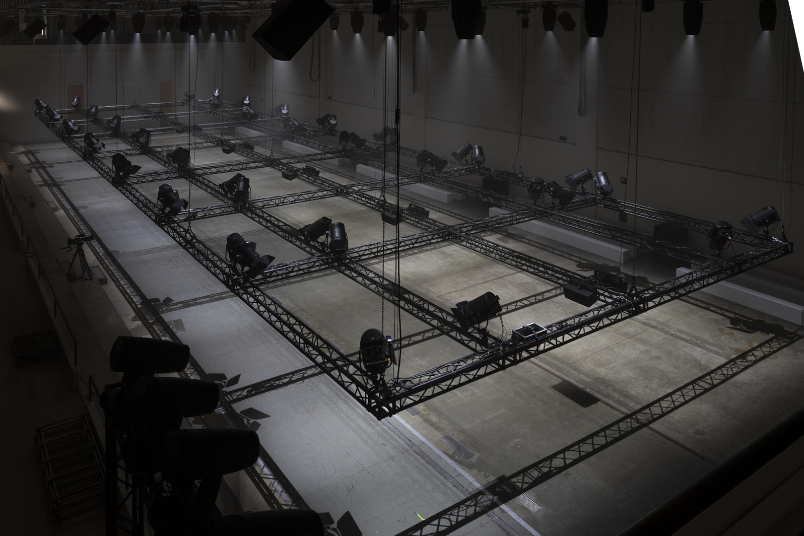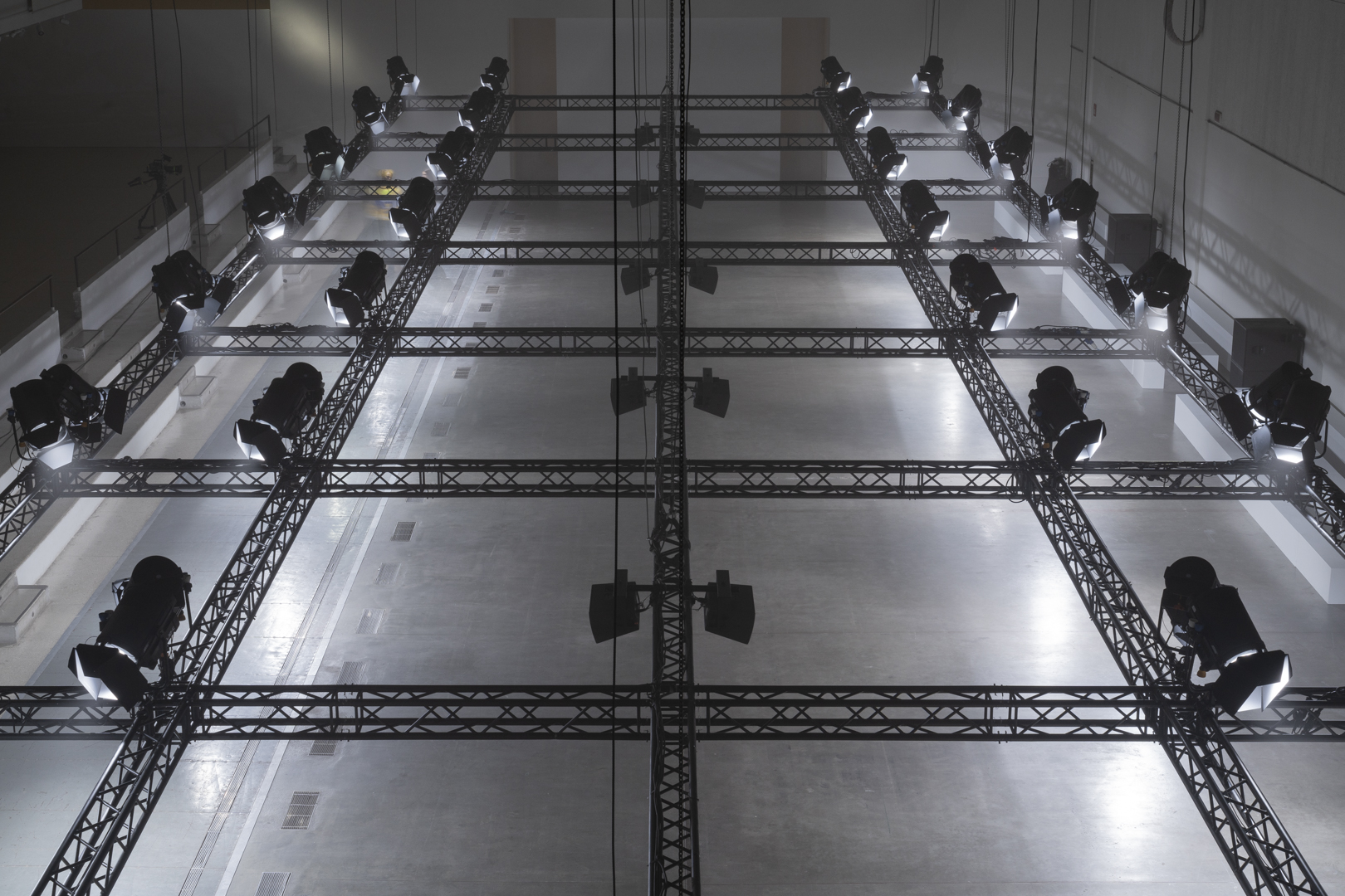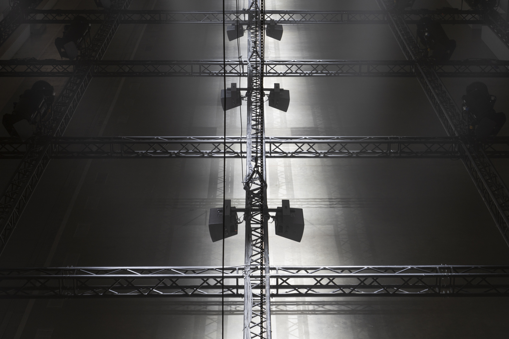 The first collaboration between Matière Noire and Maison Margiela, the scenography and light design of the SS’25 presentation stages a discrete and intangible game of shadows and constriction serving the quiet elegance of the collection. Taking the blank canvas of the location as its starting point, the proposition builds on a sober reinterpretation of the essentials of scenography, using technical light systems as architectural elements. Haunting the raw set, a first light rig hangs low from the ceiling, enclosing the space and casting a strong warm light on the passing models, while a second structure floats higher, emitting a colder hue that traces abstract shadows on the barren runway.