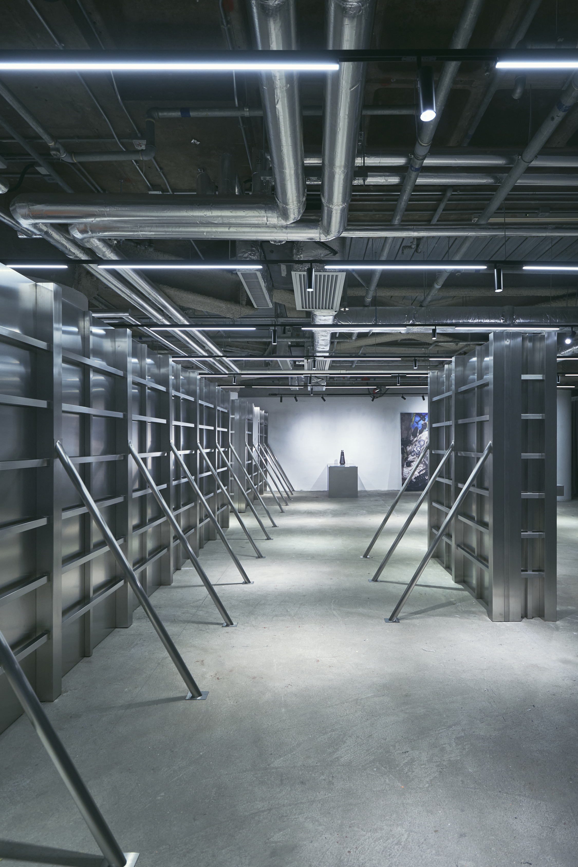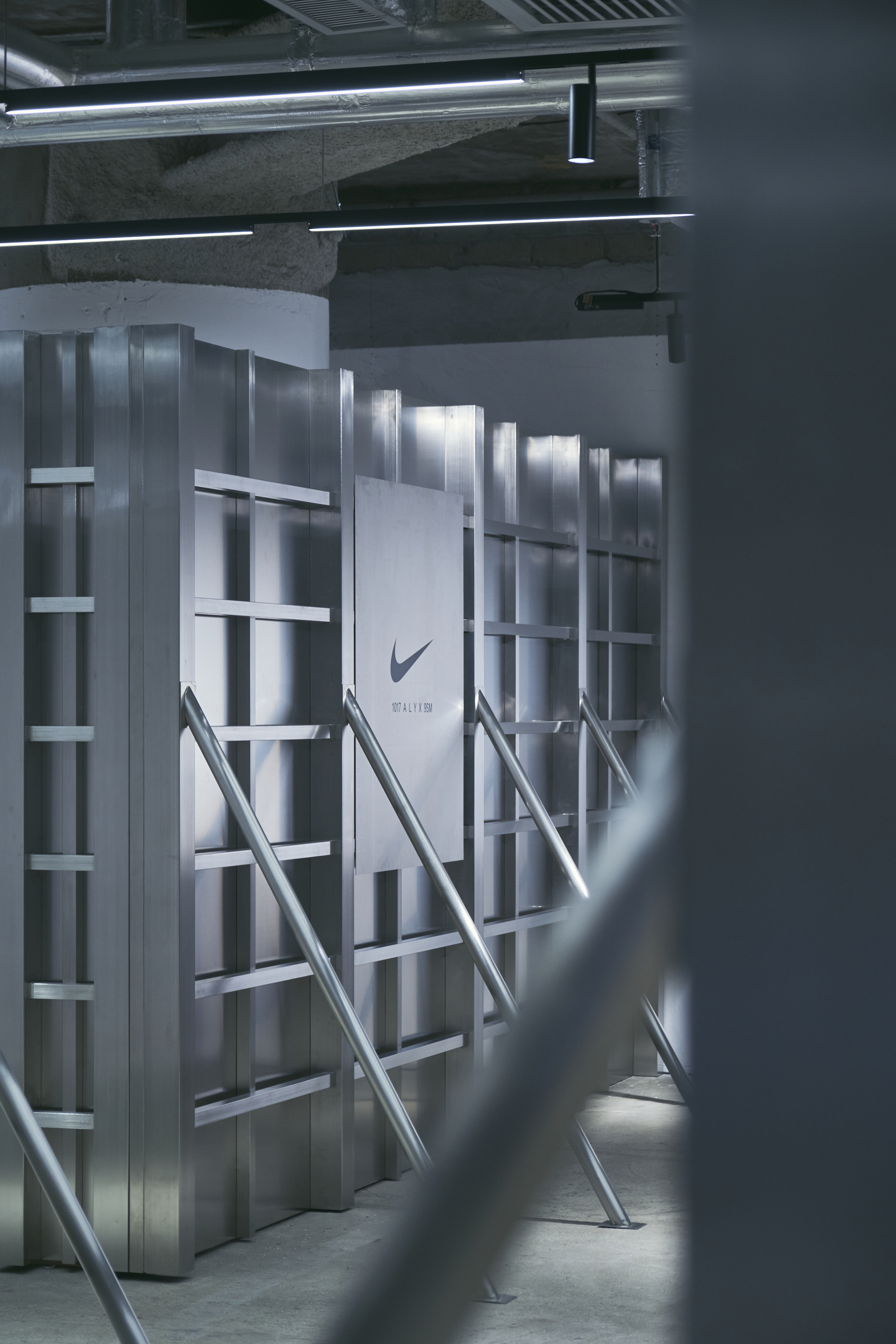 Nike / 1017 ALYX 9SM’s Hong Kong event is a unique example of solution-driven collaboration and nomadic functionality. Merging the global scale of Nike and the Americana roots of Alyx, the scenography is a brutalist nod to the Mall-Rat, Blockbuster aesthetic of the nineties. Its multi-purpose wall system is engineered to facilitate every step of the process, while creating a distinct atmosphere in the space it is bound to occupy. Made exclusively from lightweight aluminium, its simplified structure can be produced in a reductive chain, from supply, to shipping and on-site assembling. The architecture of the display is fashioned by the parameters of the space, the halls of gilded walls evoking the backstage of an amusement park that the public is invited to lose itself in. LED screens loom over a succession of rooms, reflecting the visual excess of the entertainment industry and the chapters of this layered collaboration.