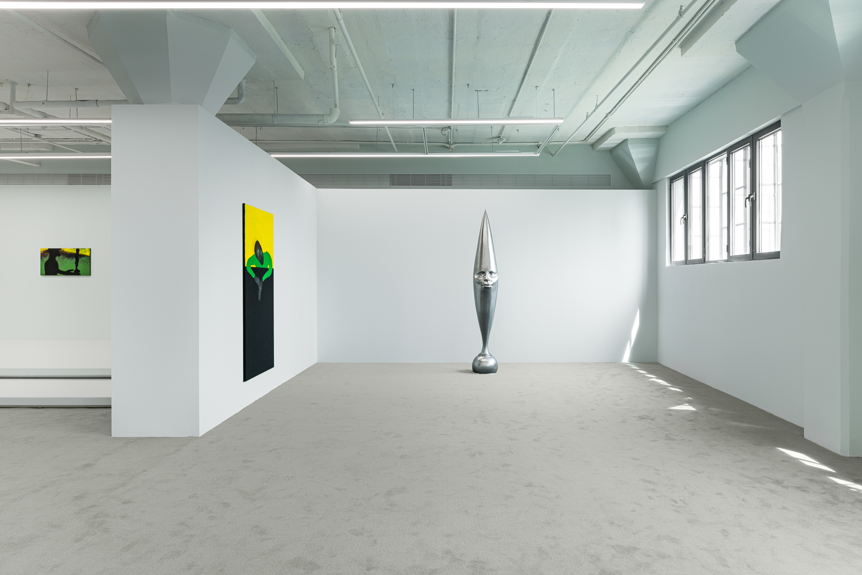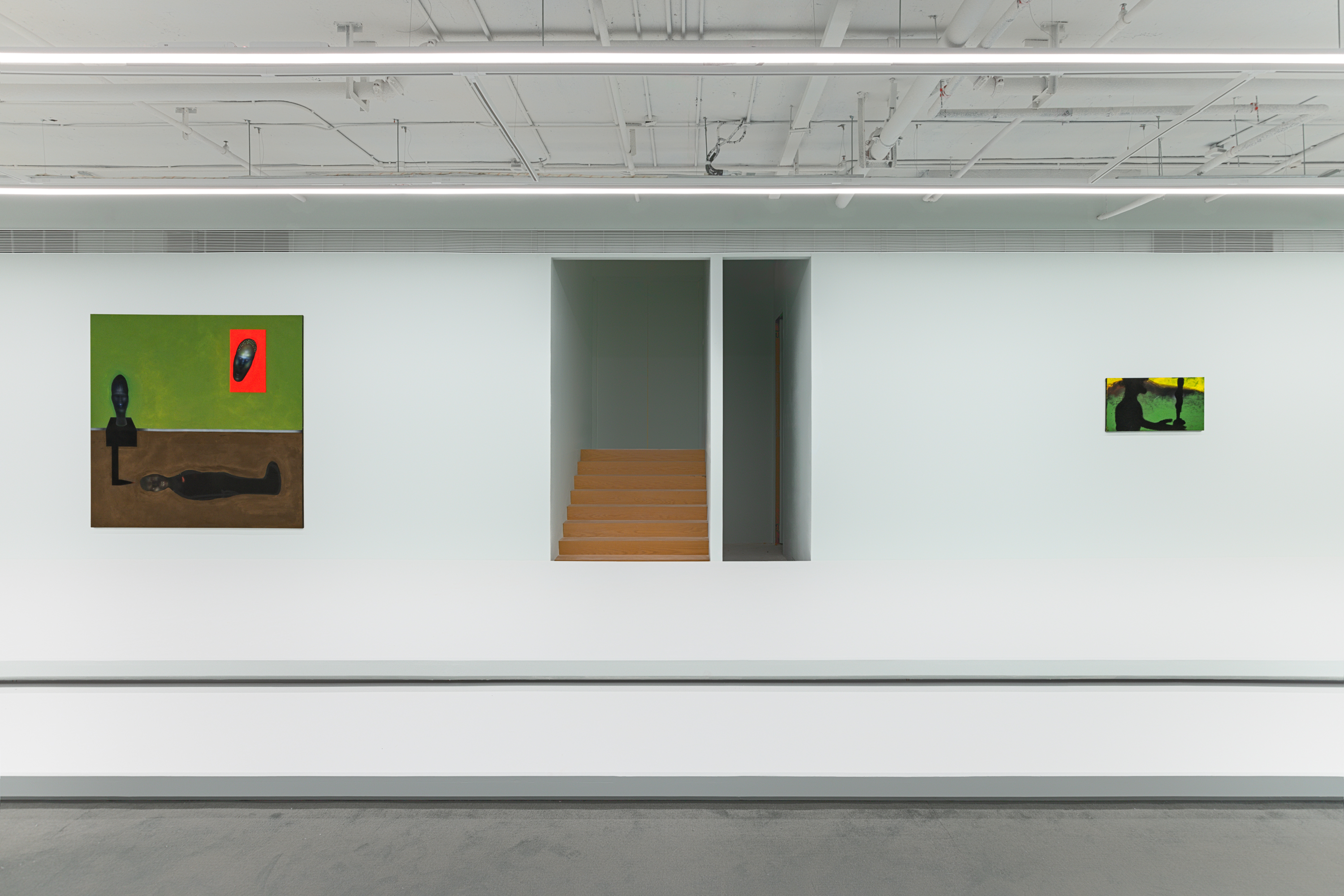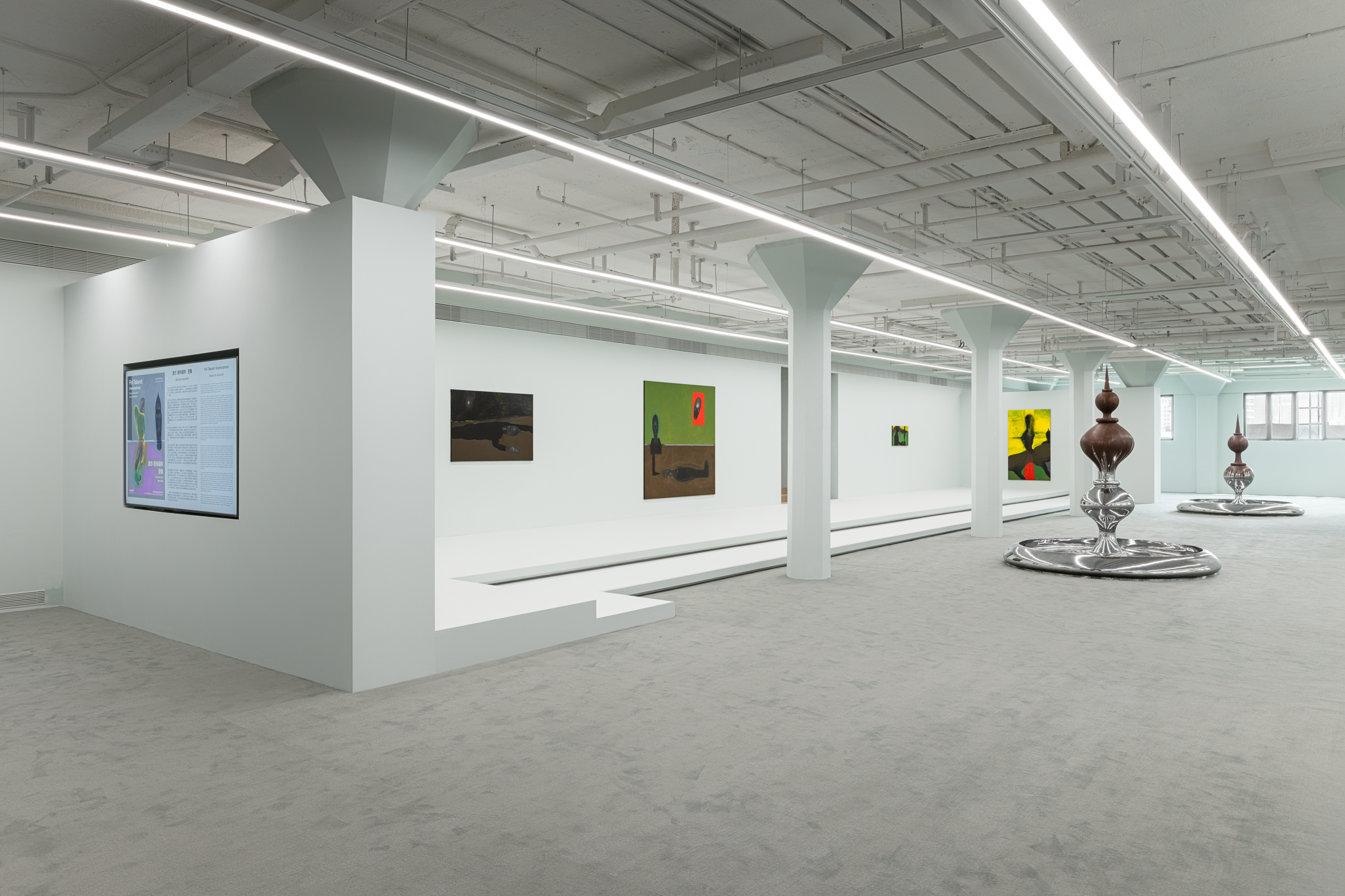 An elevated platform with dove-white carpeting frames the labyrinthine panels displaying Pol Taburet’s canvases and imposing a subtly symbolic step, the physical reposition necessary to anamorphosis. Gleaming fountains eaten away by rust reveal refracted fragments of the paintings’ ghostly figures intertwined with the clinical glow of LED stripes, complementing the perspectival shift prompted by the deck. An exercise in side-gazing, Matière Noire’s dynamic scenography offers a layered wandering through a bureaucratic ambiance of corporate constriction, allowing for the works to become contrasting elements in a display of dissension.