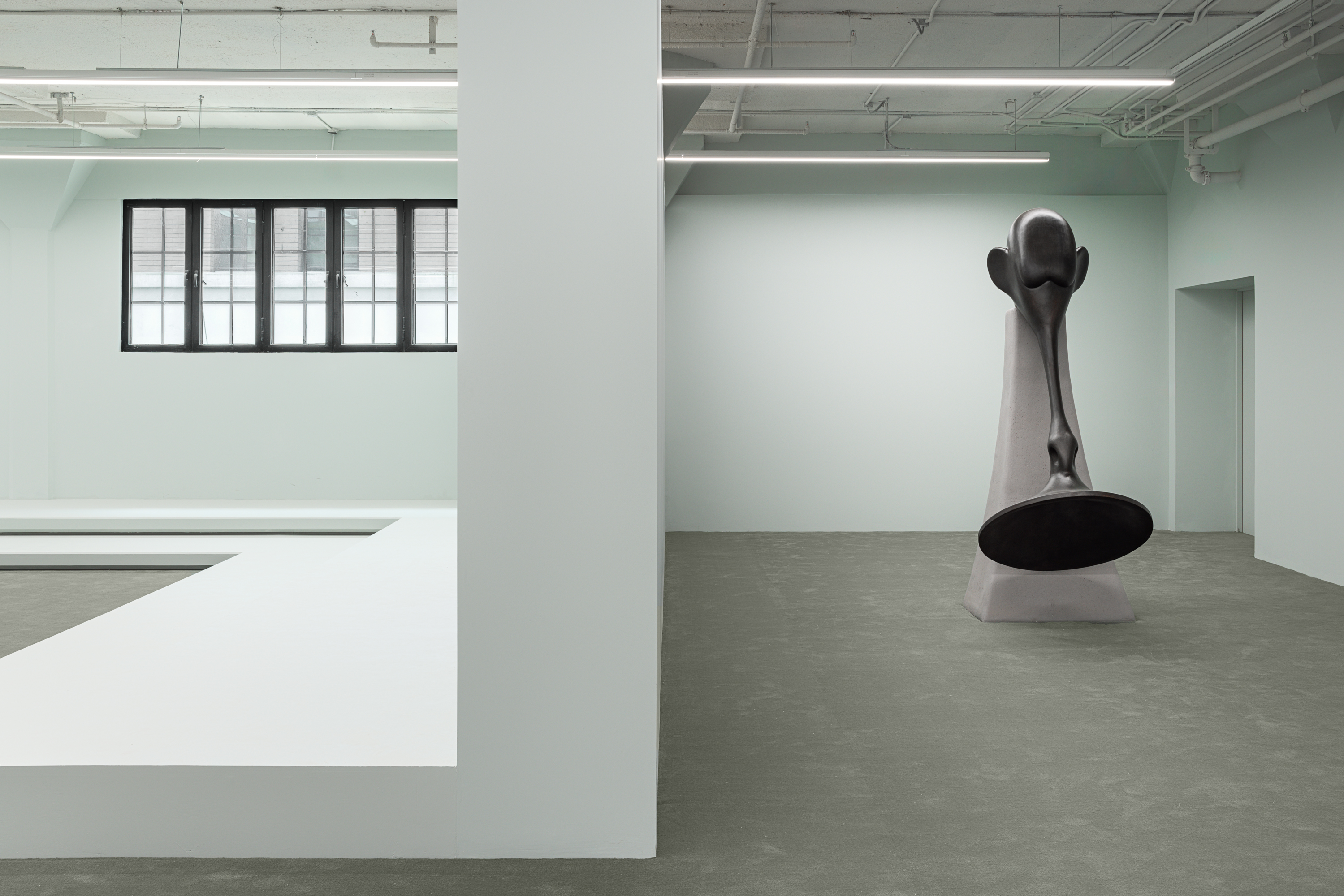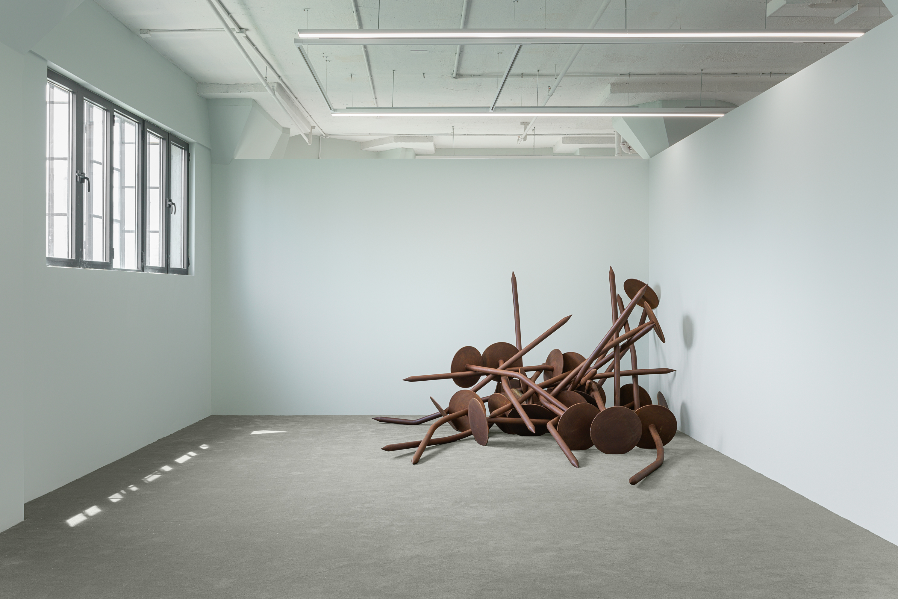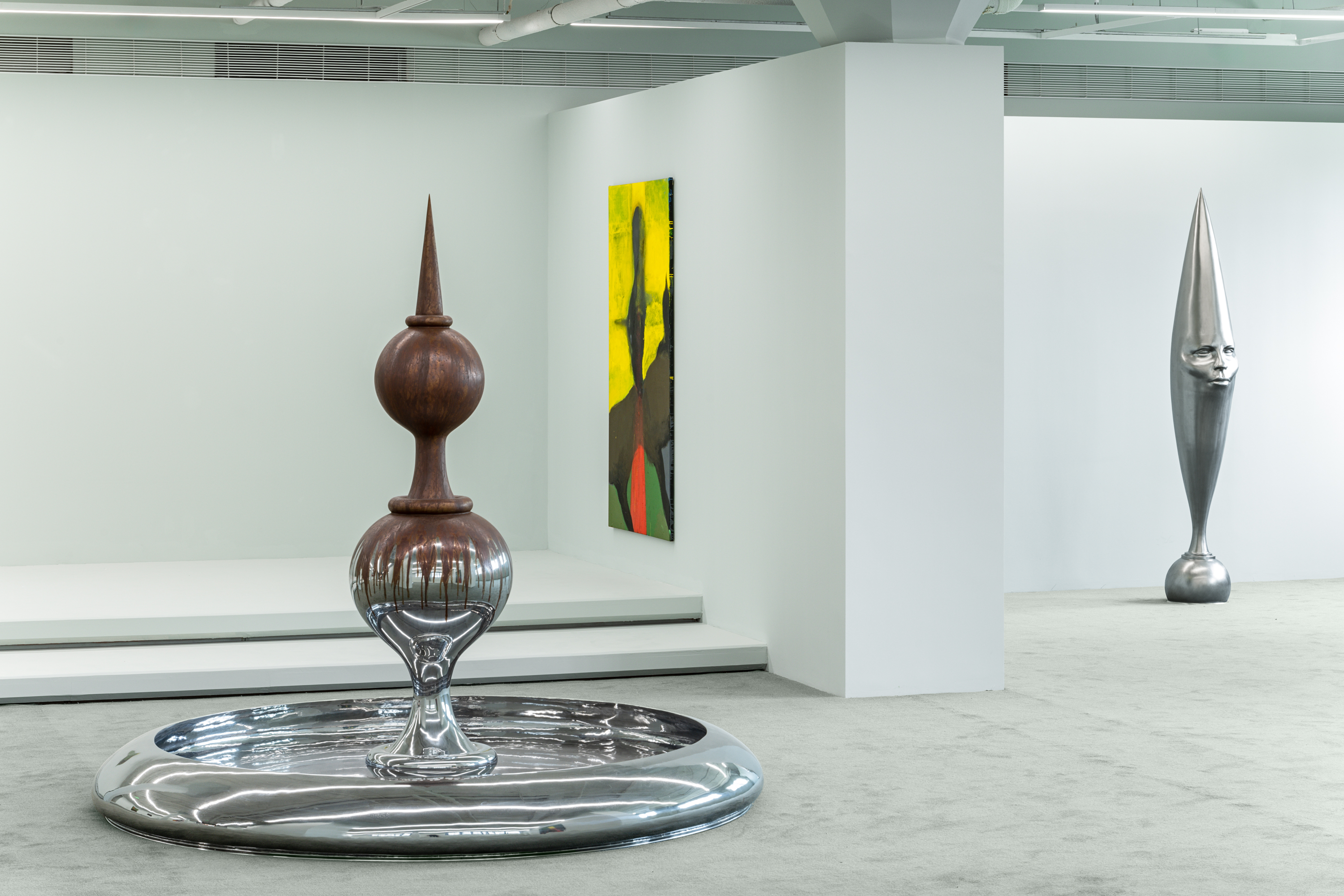 An elevated platform with dove-white carpeting frames the labyrinthine panels displaying Pol Taburet’s canvases and imposing a subtly symbolic step, the physical reposition necessary to anamorphosis. Gleaming fountains eaten away by rust reveal refracted fragments of the paintings’ ghostly figures intertwined with the clinical glow of LED stripes, complementing the perspectival shift prompted by the deck. An exercise in side-gazing, Matière Noire’s dynamic scenography offers a layered wandering through a bureaucratic ambiance of corporate constriction, allowing for the works to become contrasting elements in a display of dissension.