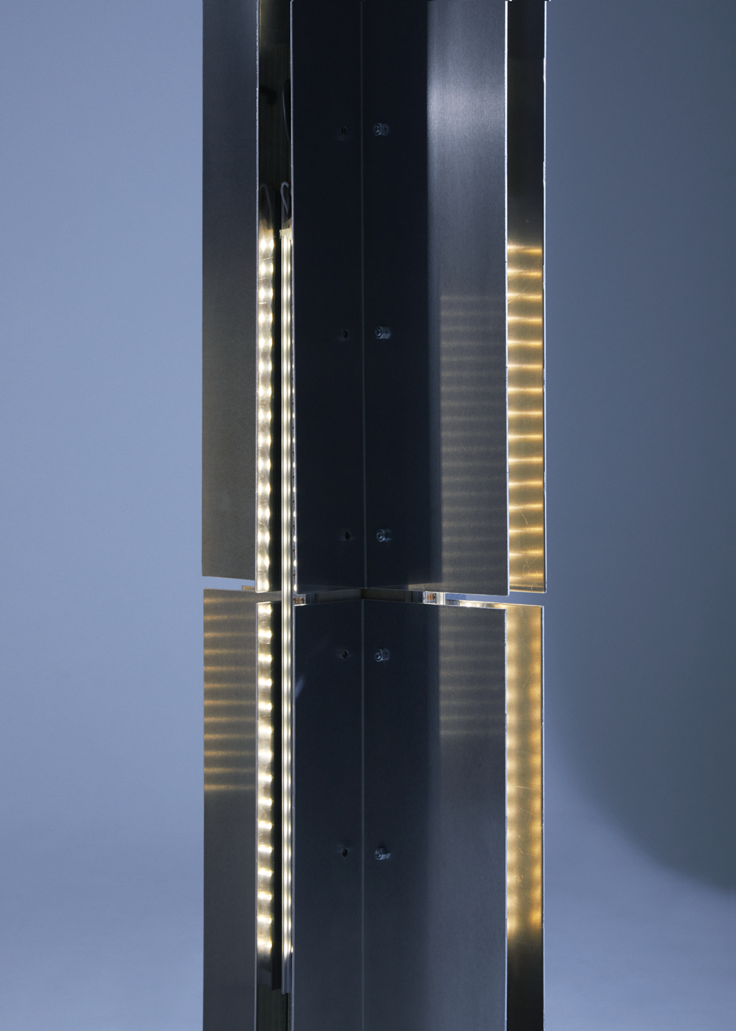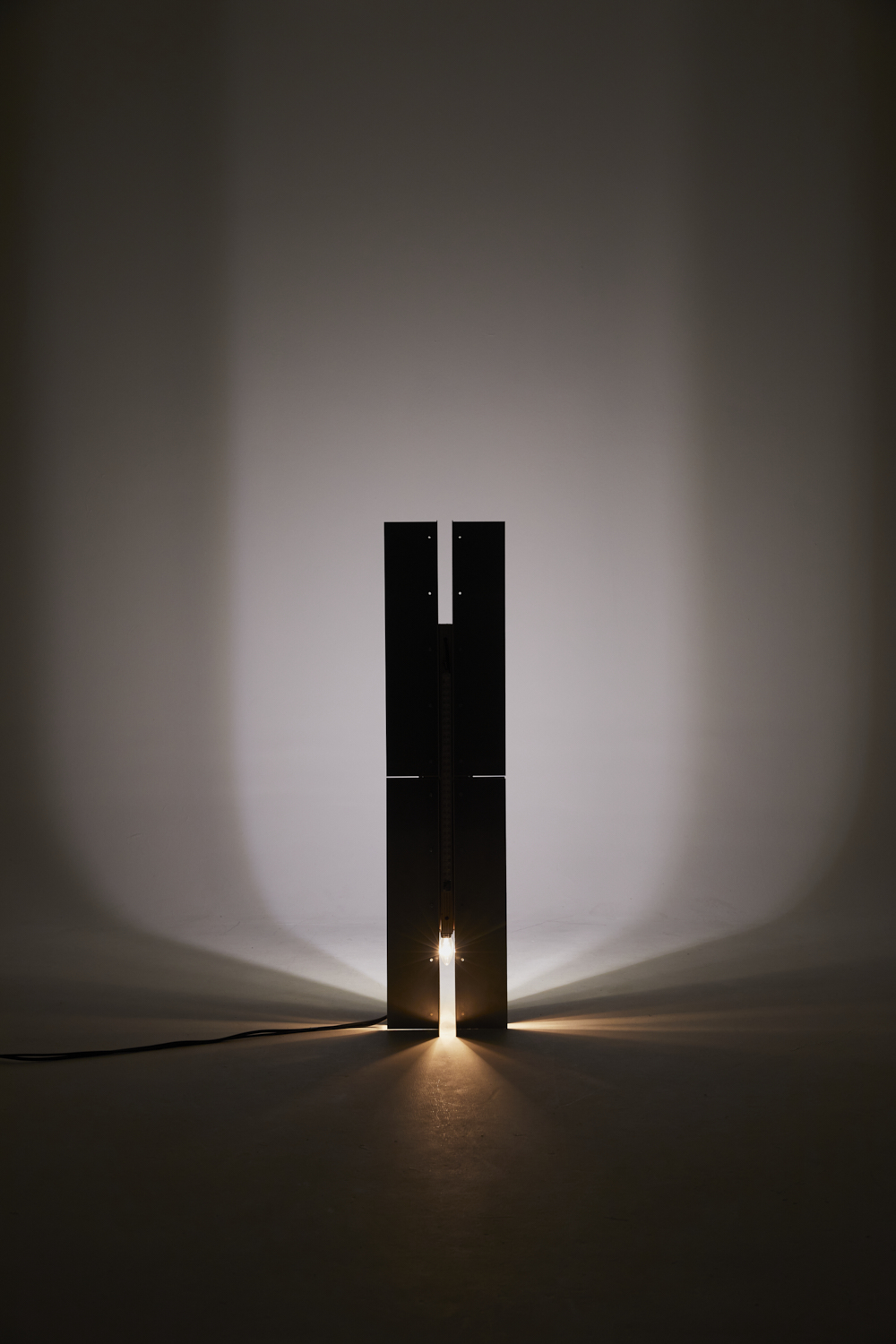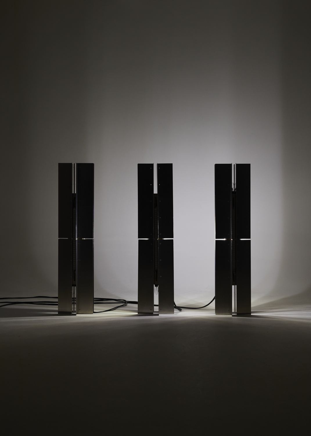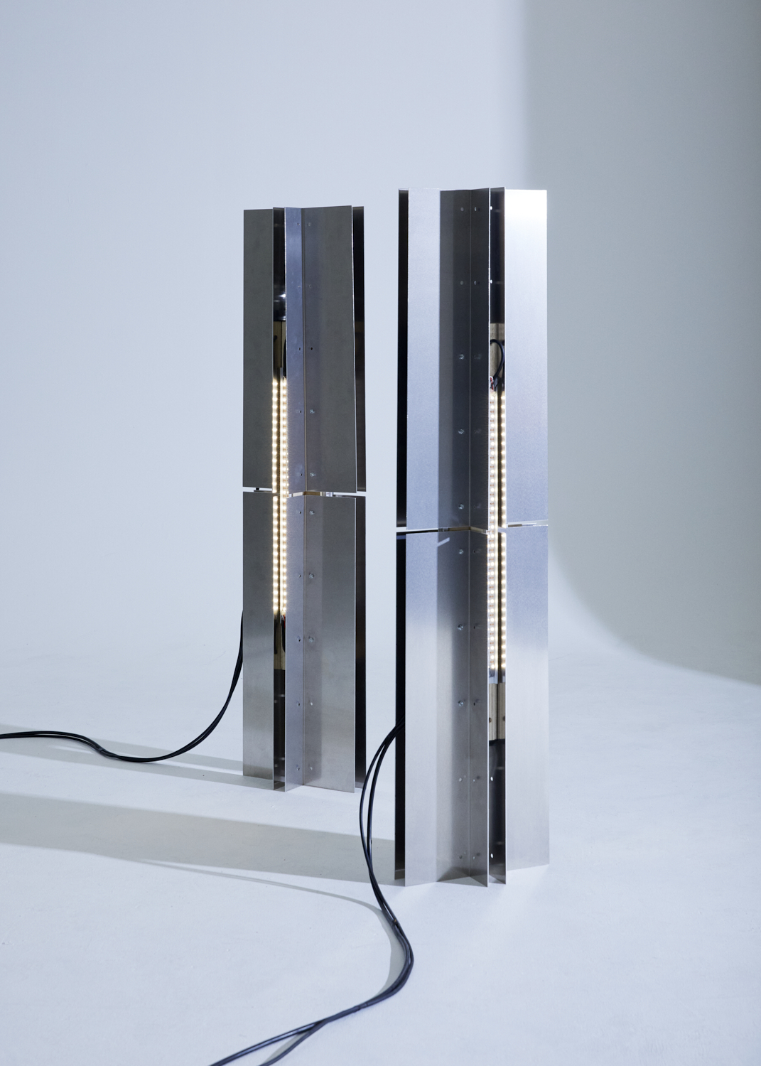 Three light sculptures accompany artists Gaspar Claus and Basile 3 on stage. Three presences that tell the story of light, interacting with each other and with the artists to the rhythm of their musical variations. Each sculpture offers three different light systems, enabling a multitude of effects: an indirect incandescent source, a wide-open beam that cloaks the stage, a tight beam that cuts through the space, modifying the volumetric perception of the room. Each light source can be controlled in intensity and focus, enabling complex light scenes to be composed at each live event.