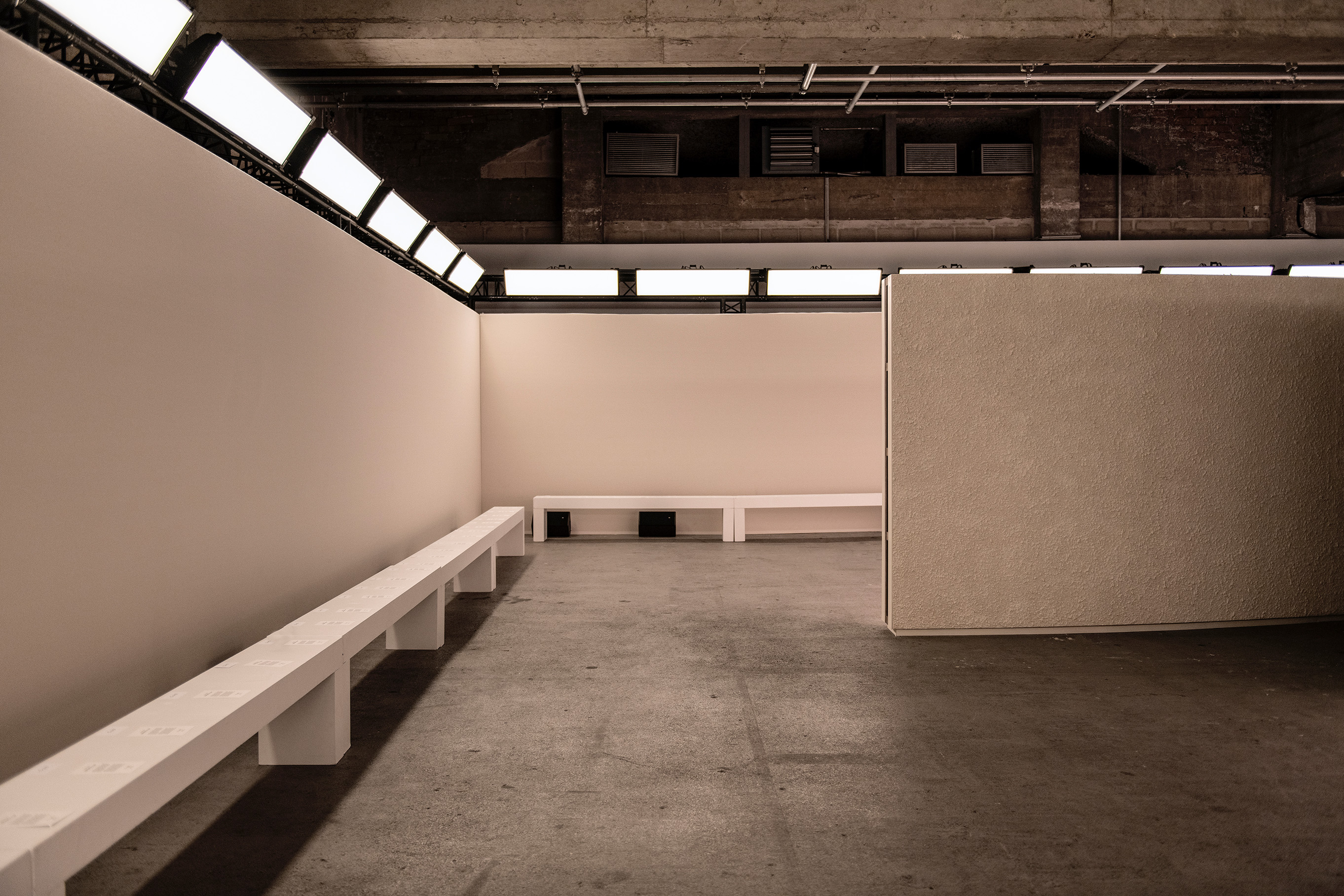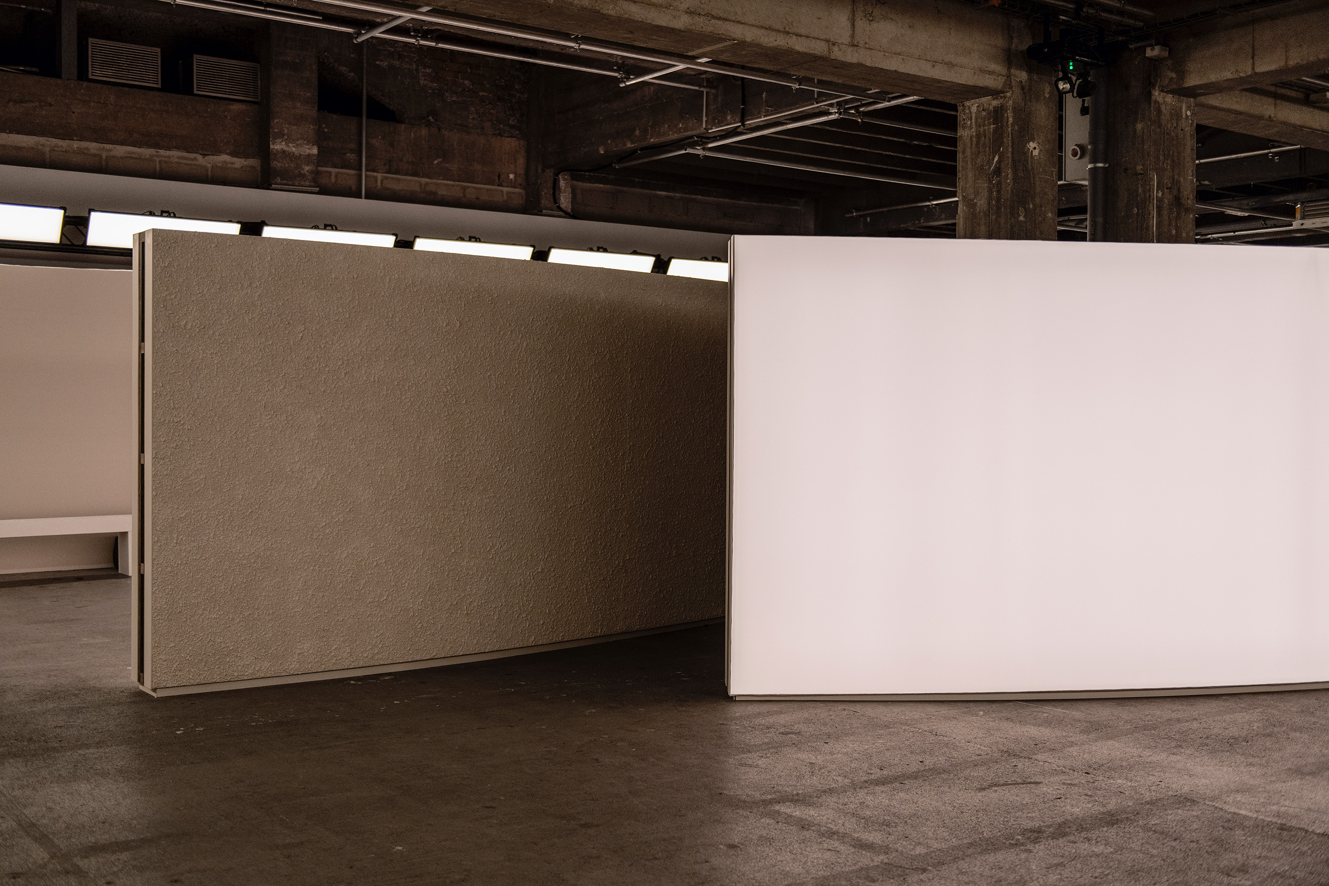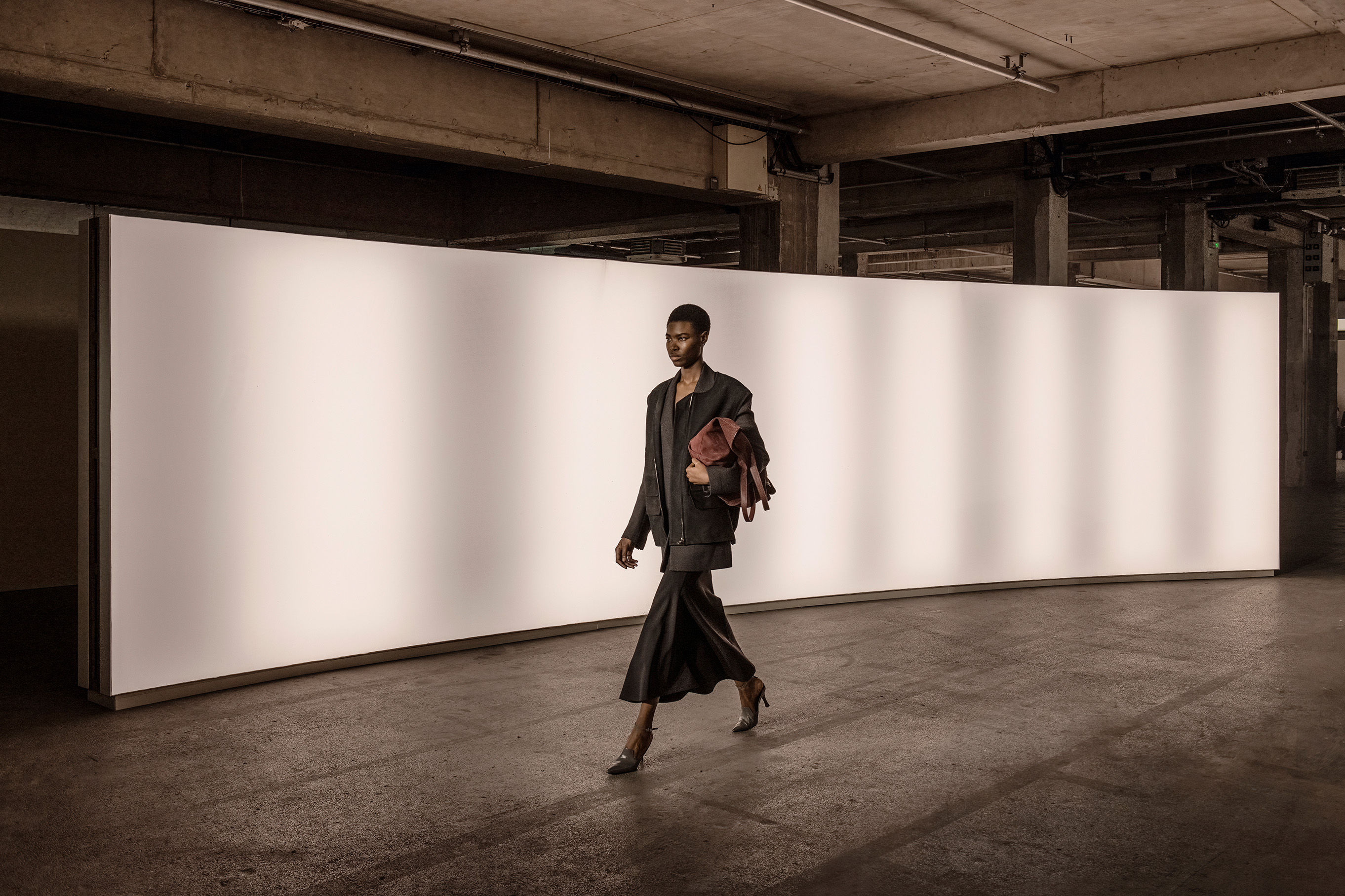 Staged in the vaulted volume of the Palais de Tokyo, Time’s SS’24 runway presentation carves minimilastic shadows out of textured surfaces. Curved panels sinew down the runway like poetic brackets in a poetry of motion, a Land-Art vestige brought indoors. One face is rouch-cast, emulating the soft grain of stone, the Barisol exterior etches a sleek, futuristic edge down the spine of the catwalk. Shifting from one side to the other, the season’s silhouettes dispel subtle shadow patterns on the concrete floor.